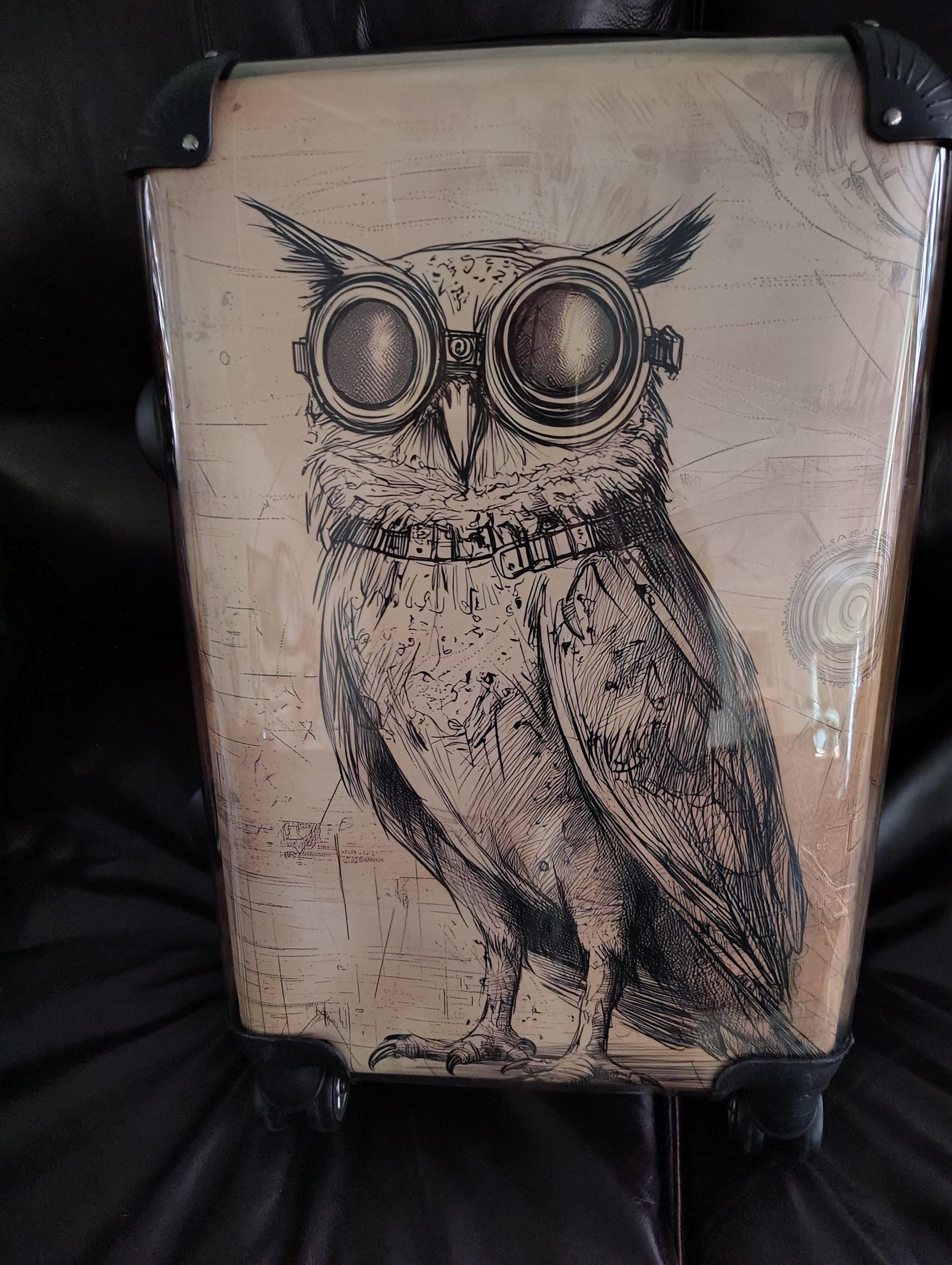 Owl Vintage sketch art featured on suitcase. Hardshell suitcases customizable for you !!