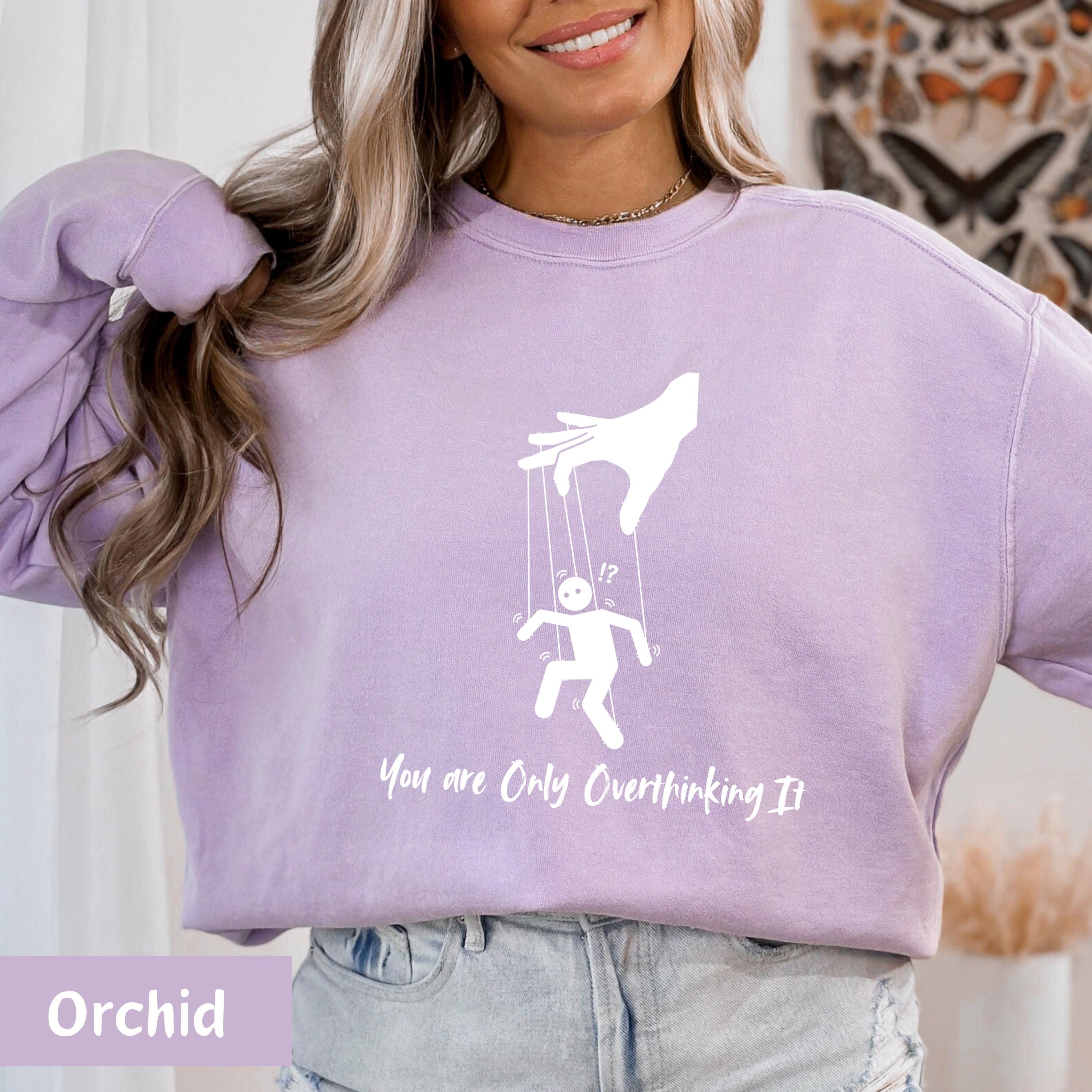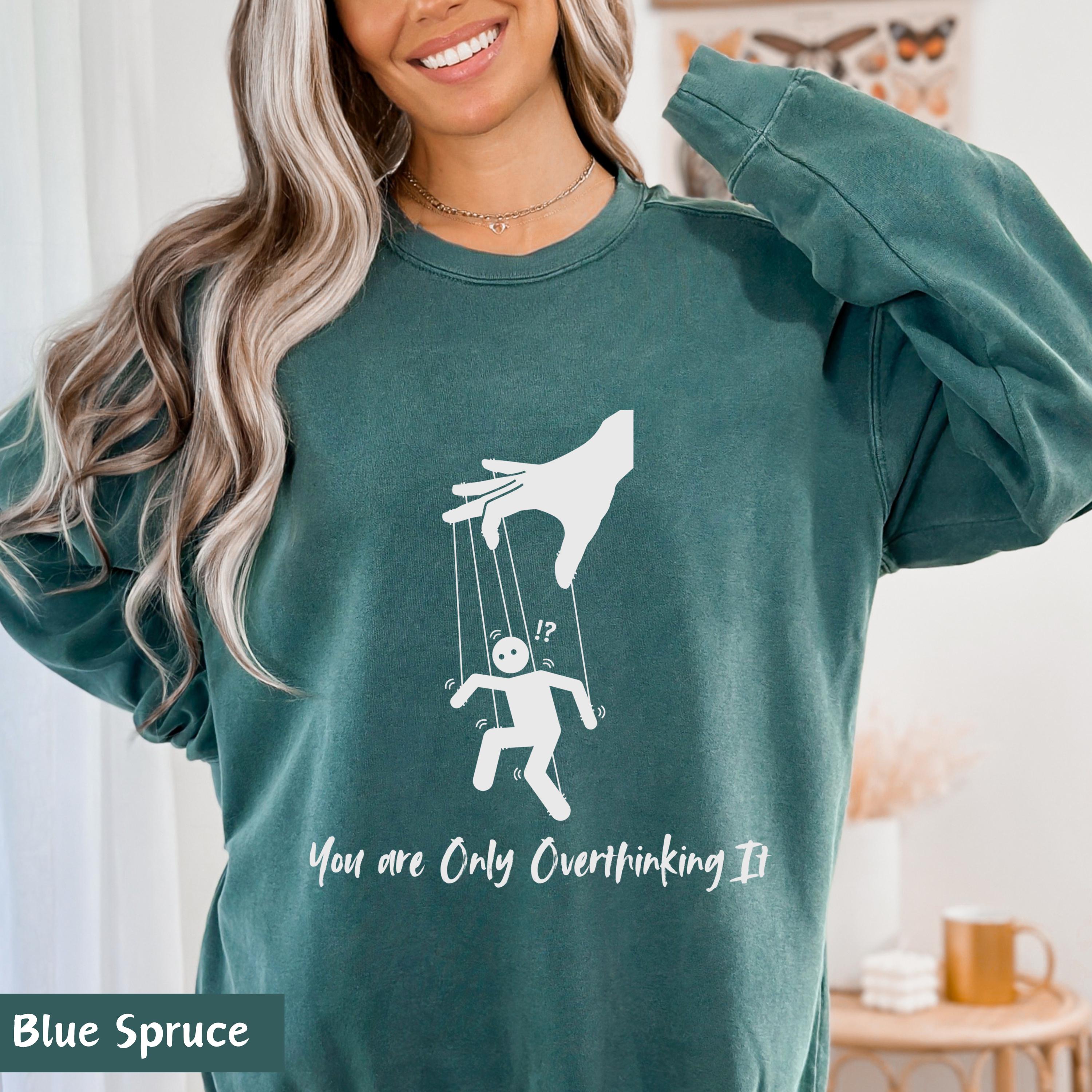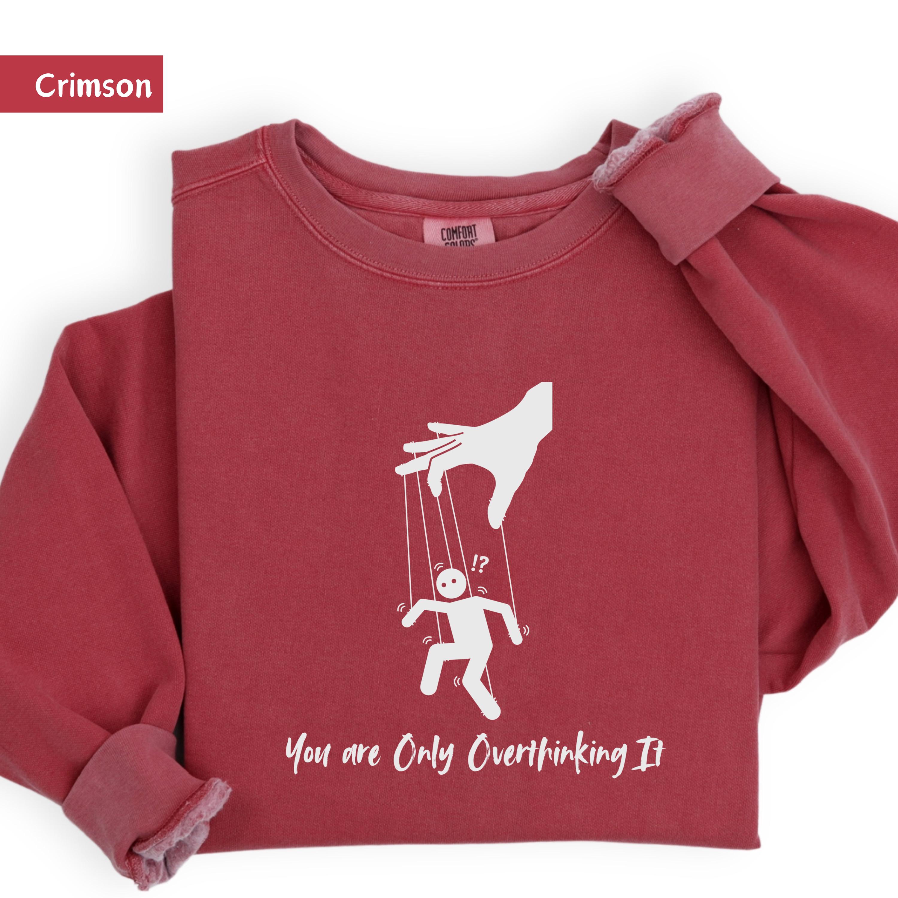 This unique gaslighting comfort colors sweatshirt features a bold puppet-string design paired with the sarcastic phrase “You are Only Overthinking It.” Perfect for anyone who enjoys dark humor, ironic fashion, and calling out manipulation in a stylish way.