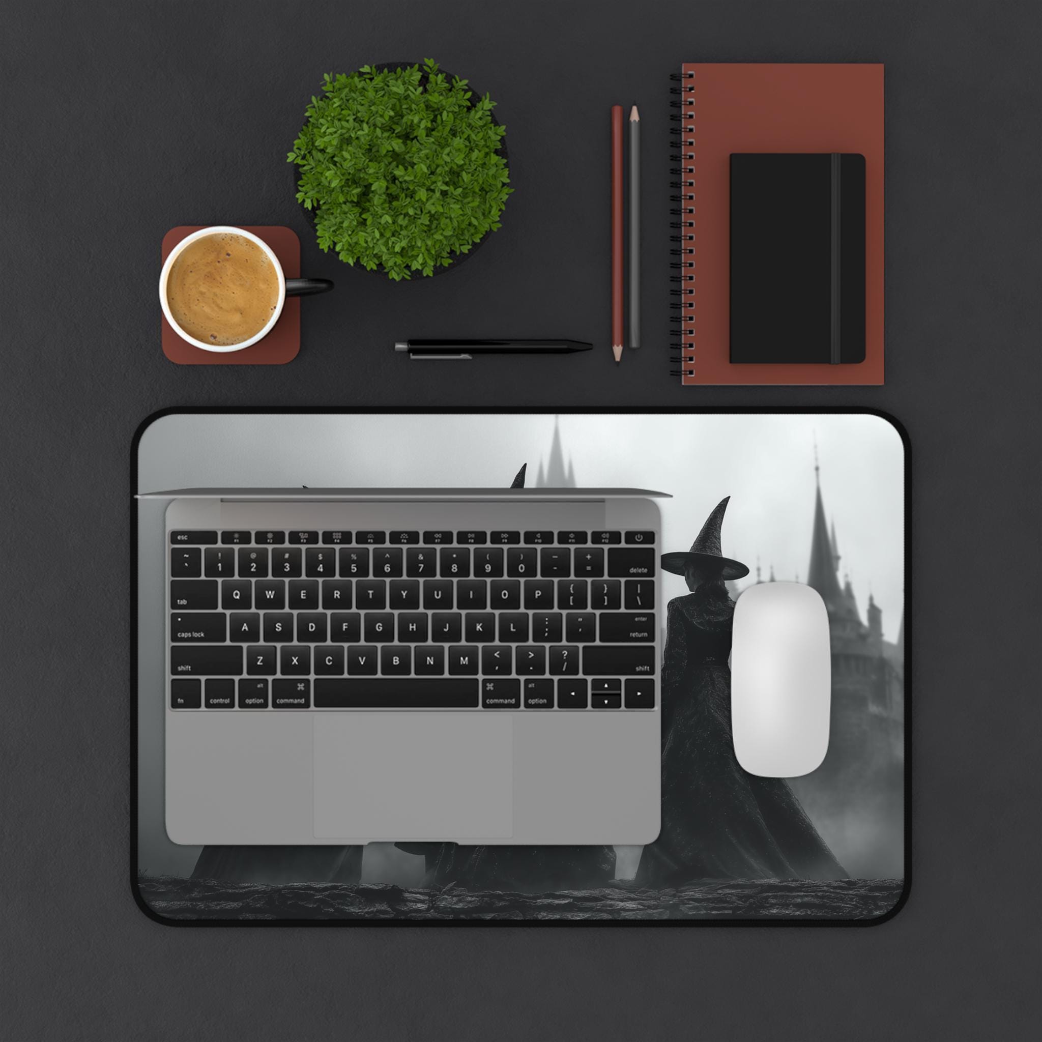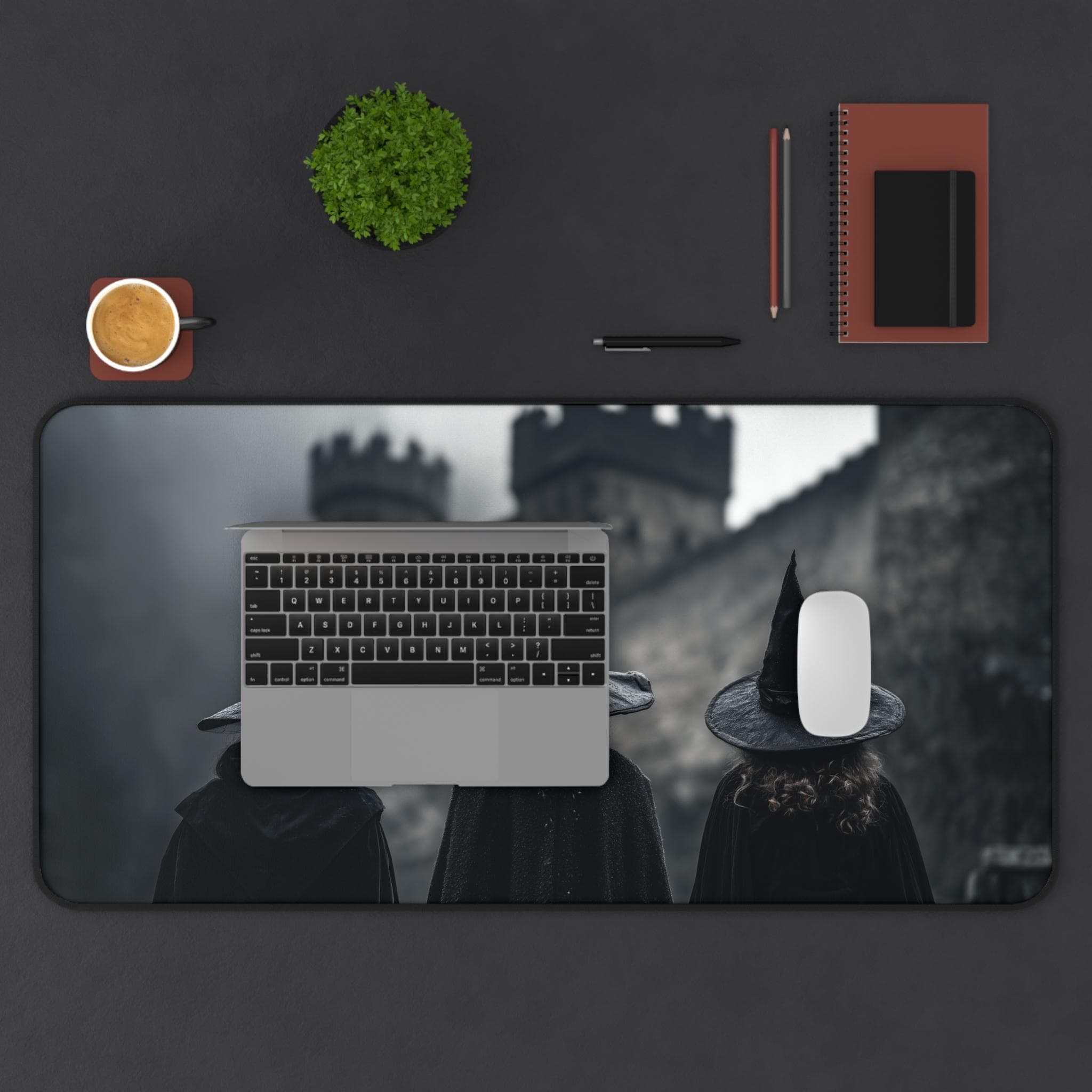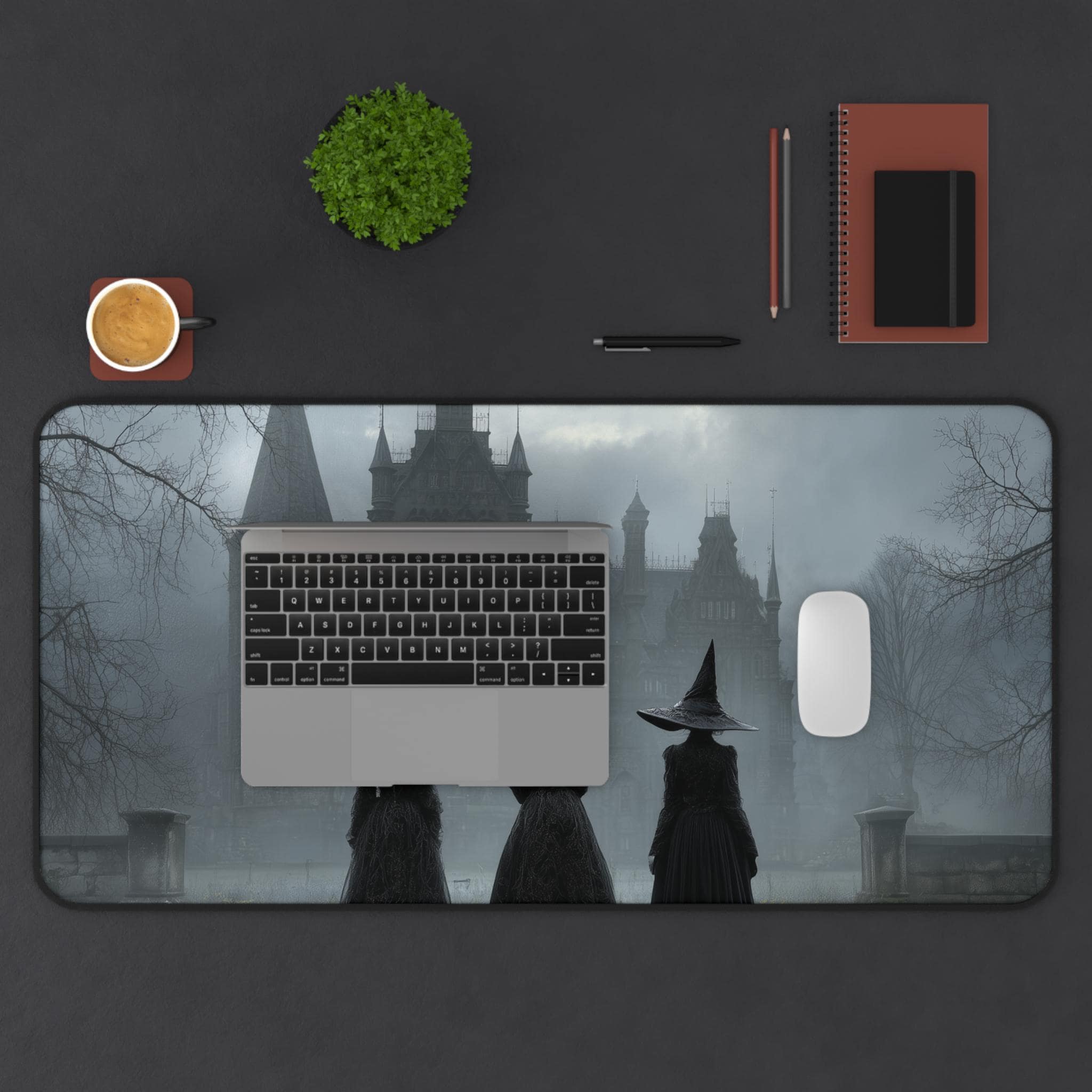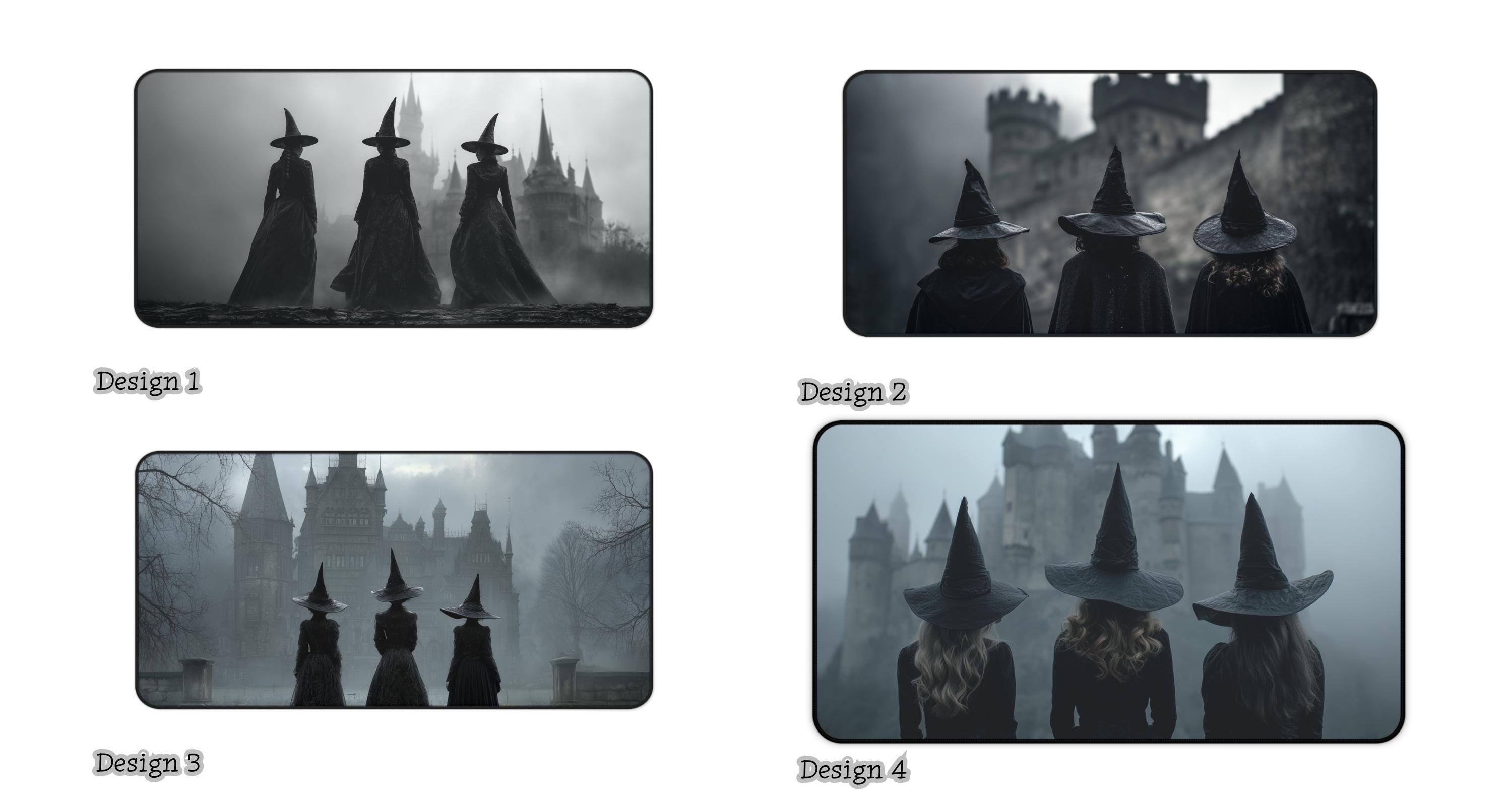 Elevate your desk space with this hauntingly beautiful witch-themed desk mat, blending gothic horror and dark academia aesthetics. Featuring witches in pointed hats before a looming black castle in a foggy night setting, the design captures a cinematic, hyper-realistic atmosphere perfect for lovers of the macabre.