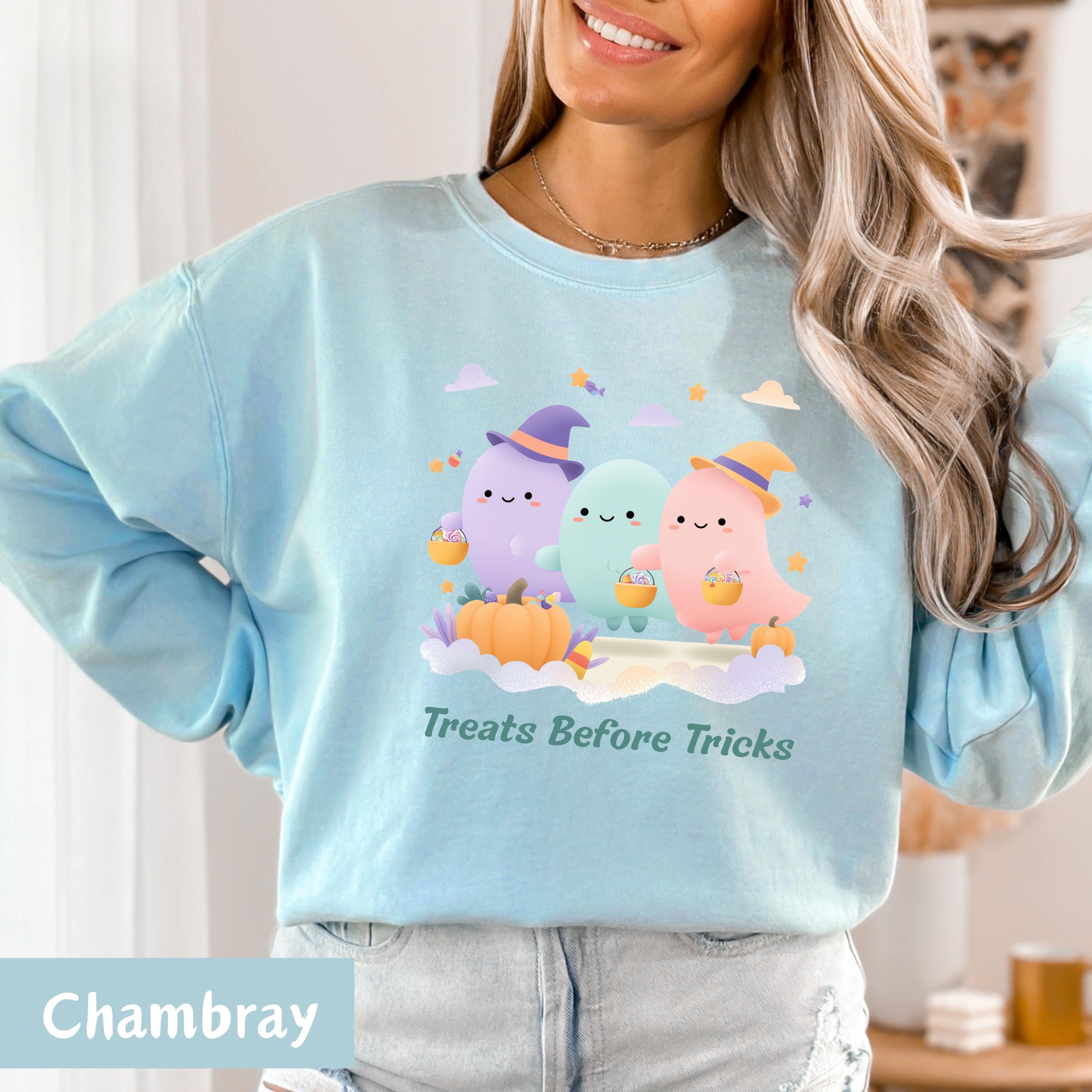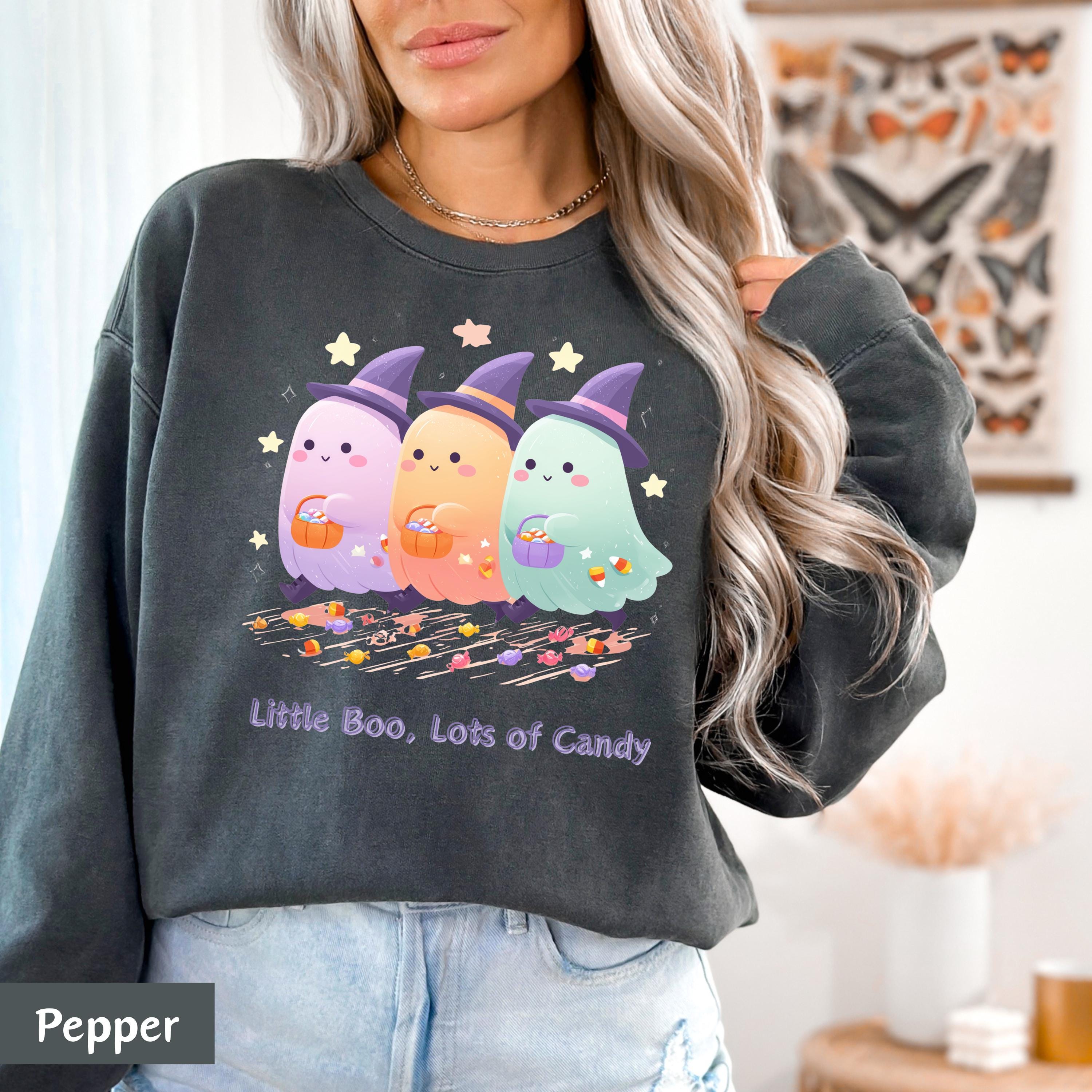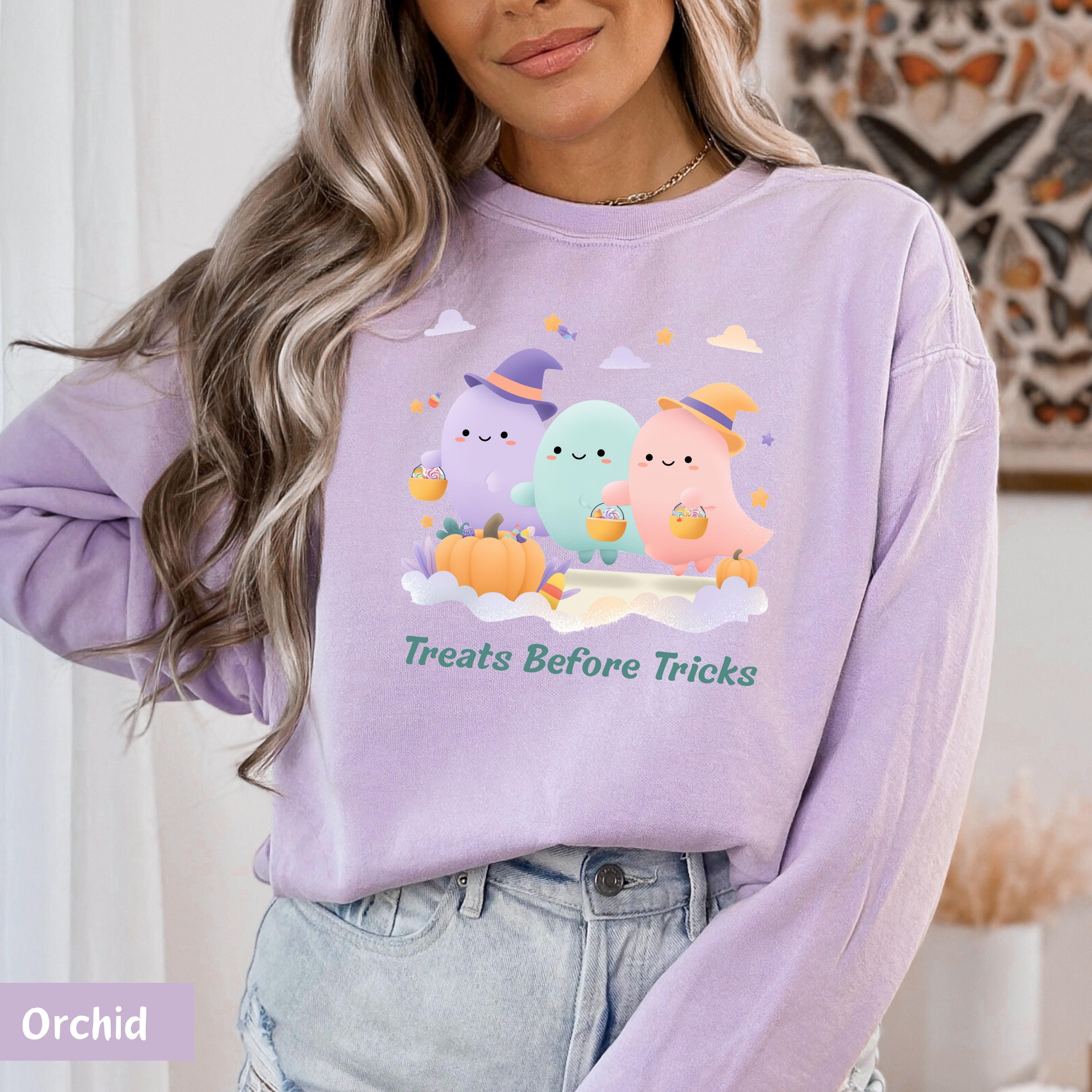 Get into the Halloween spirit with this irresistibly cute and spooky tee featuring a trio of pastel ghost friends dressed in witch hats, holding pumpkin candy buckets, and surrounded by candy, pumpkins, and floating stars! Perfect for Halloween parties, fall festivals, or cozy nights in – this shirt adds a playful touch to your spooky season wardrobe. 🌙👻