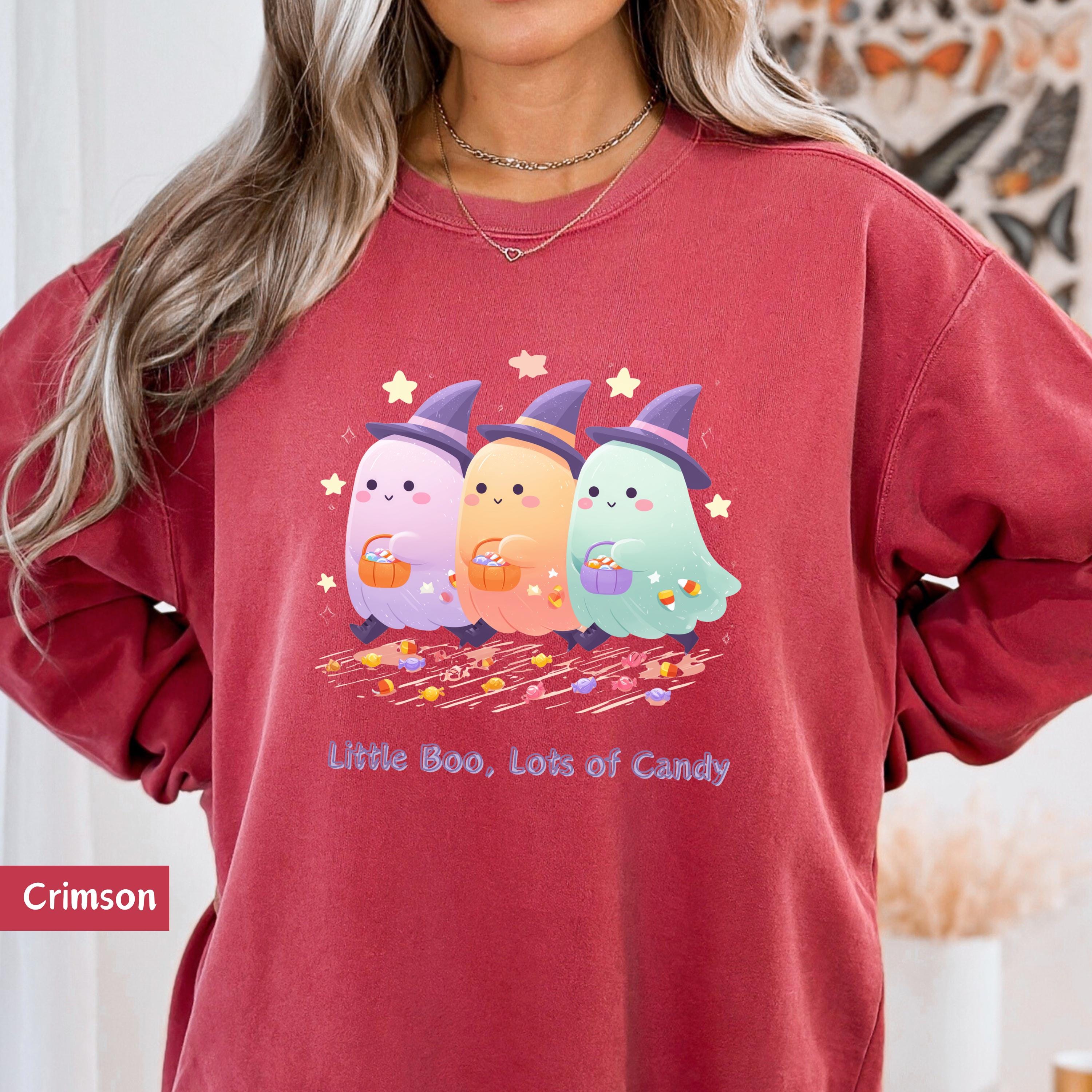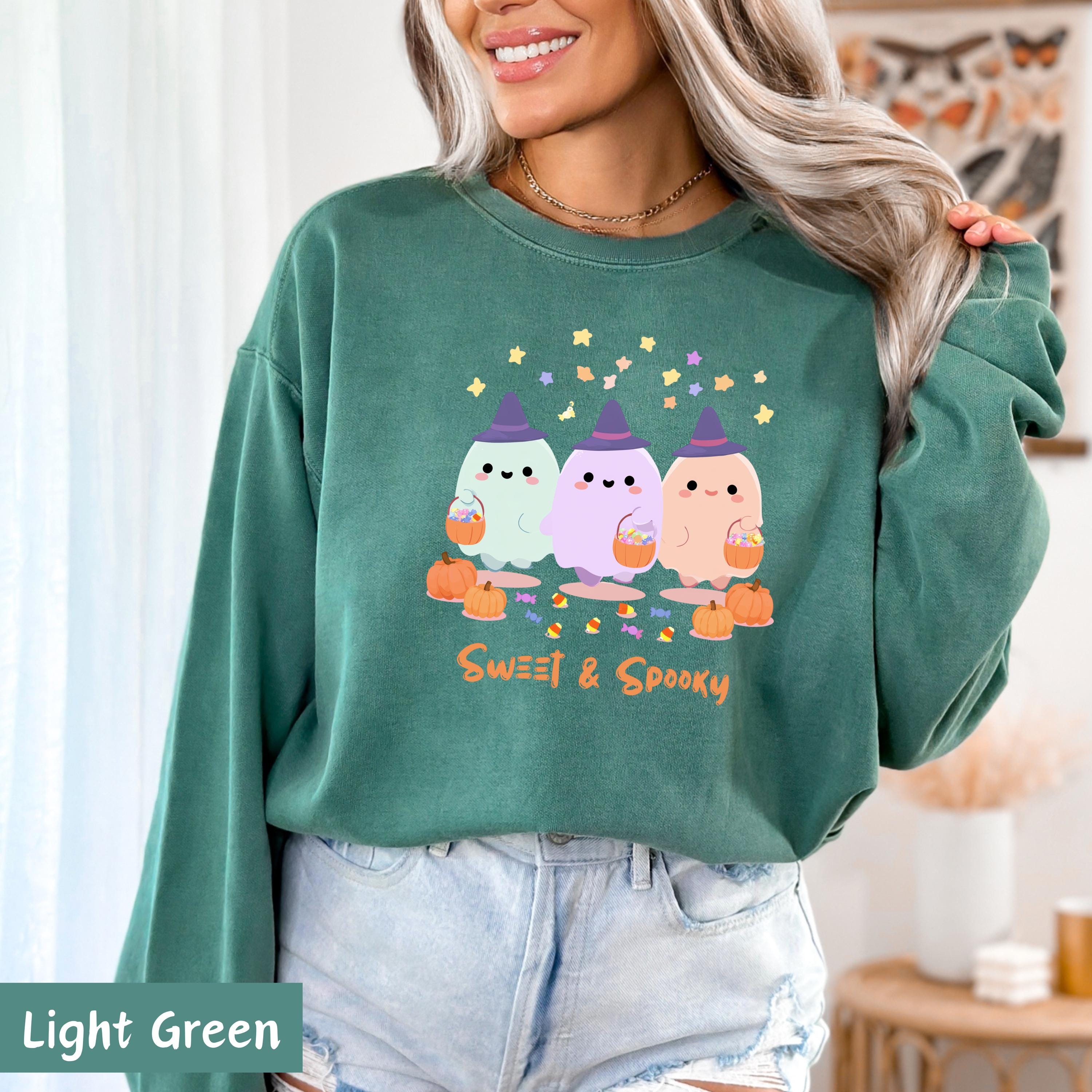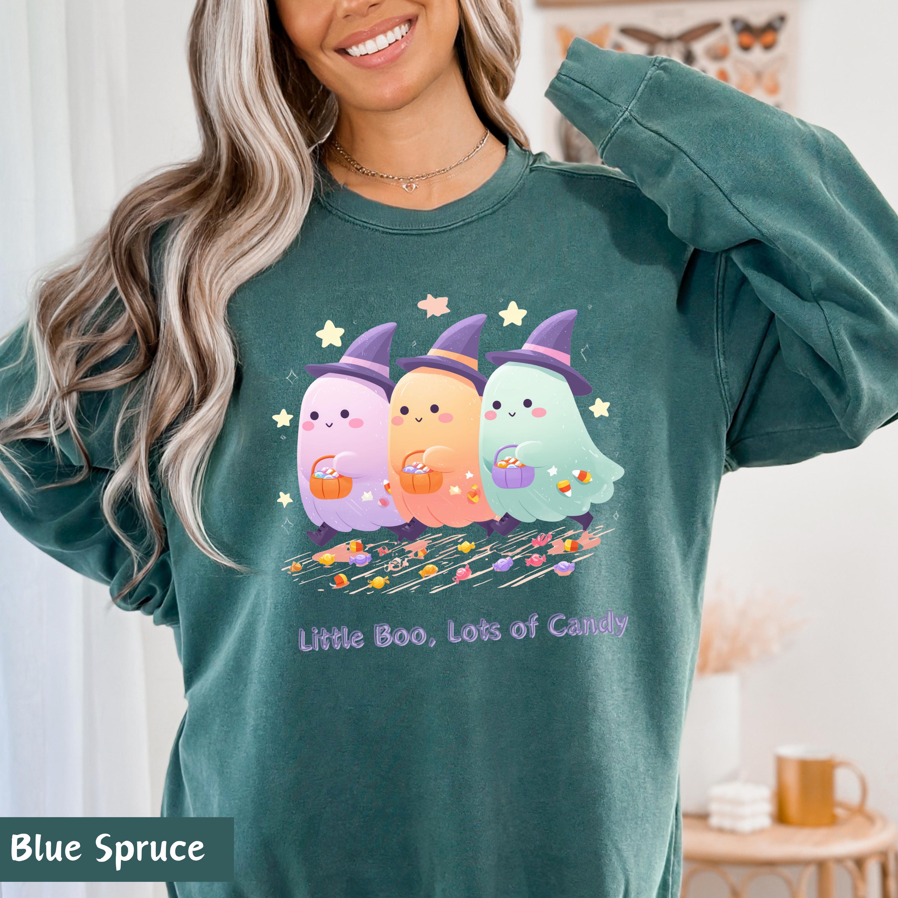 Get into the Halloween spirit with this irresistibly cute and spooky tee featuring a trio of pastel ghost friends dressed in witch hats, holding pumpkin candy buckets, and surrounded by candy, pumpkins, and floating stars! Perfect for Halloween parties, fall festivals, or cozy nights in – this shirt adds a playful touch to your spooky season wardrobe. 🌙👻