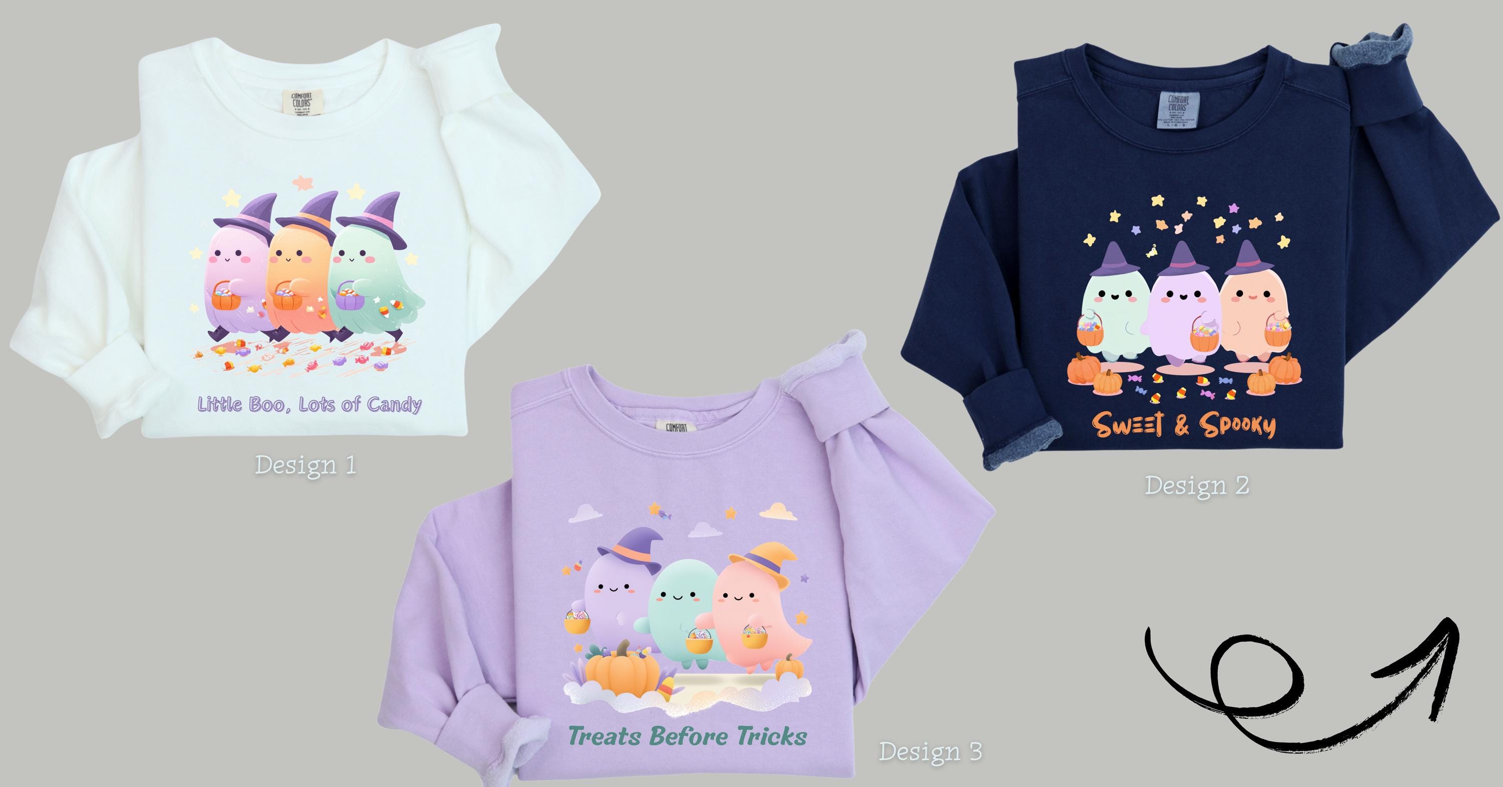 Ghost Trio Halloween Shirt – Custom Text | Cute Witch Ghosts Trick-or-Treating | Fall Aesthetic Tee | Halloween Gift, Halloween Cany Shirt