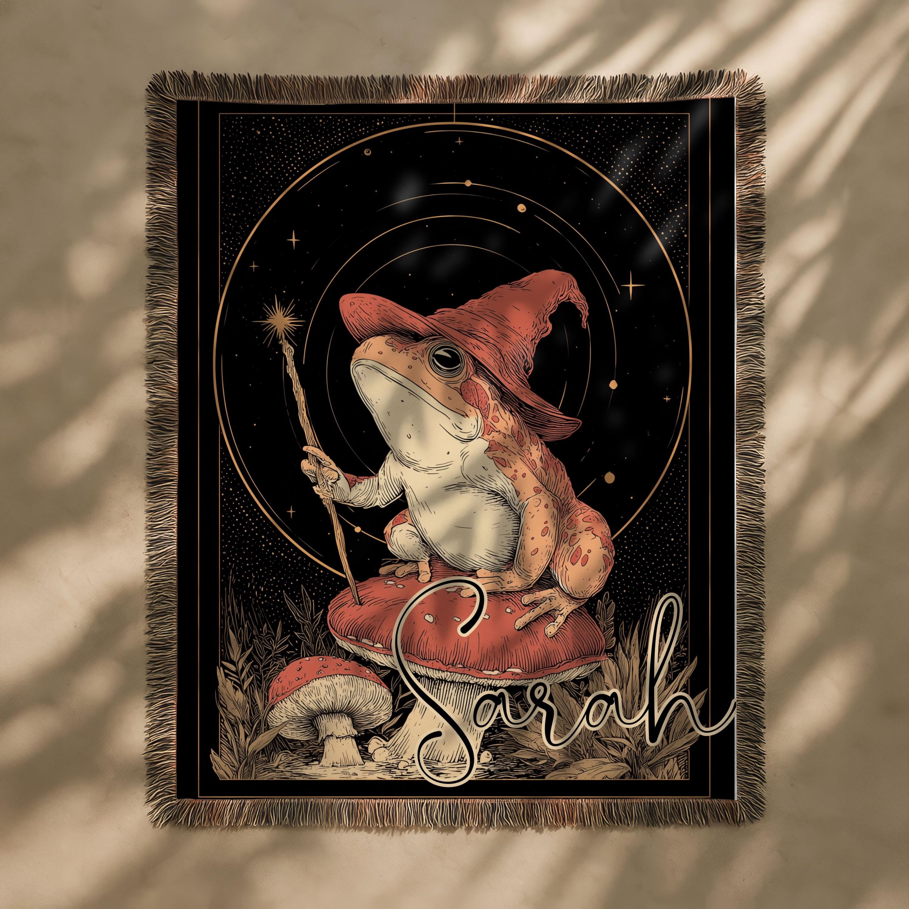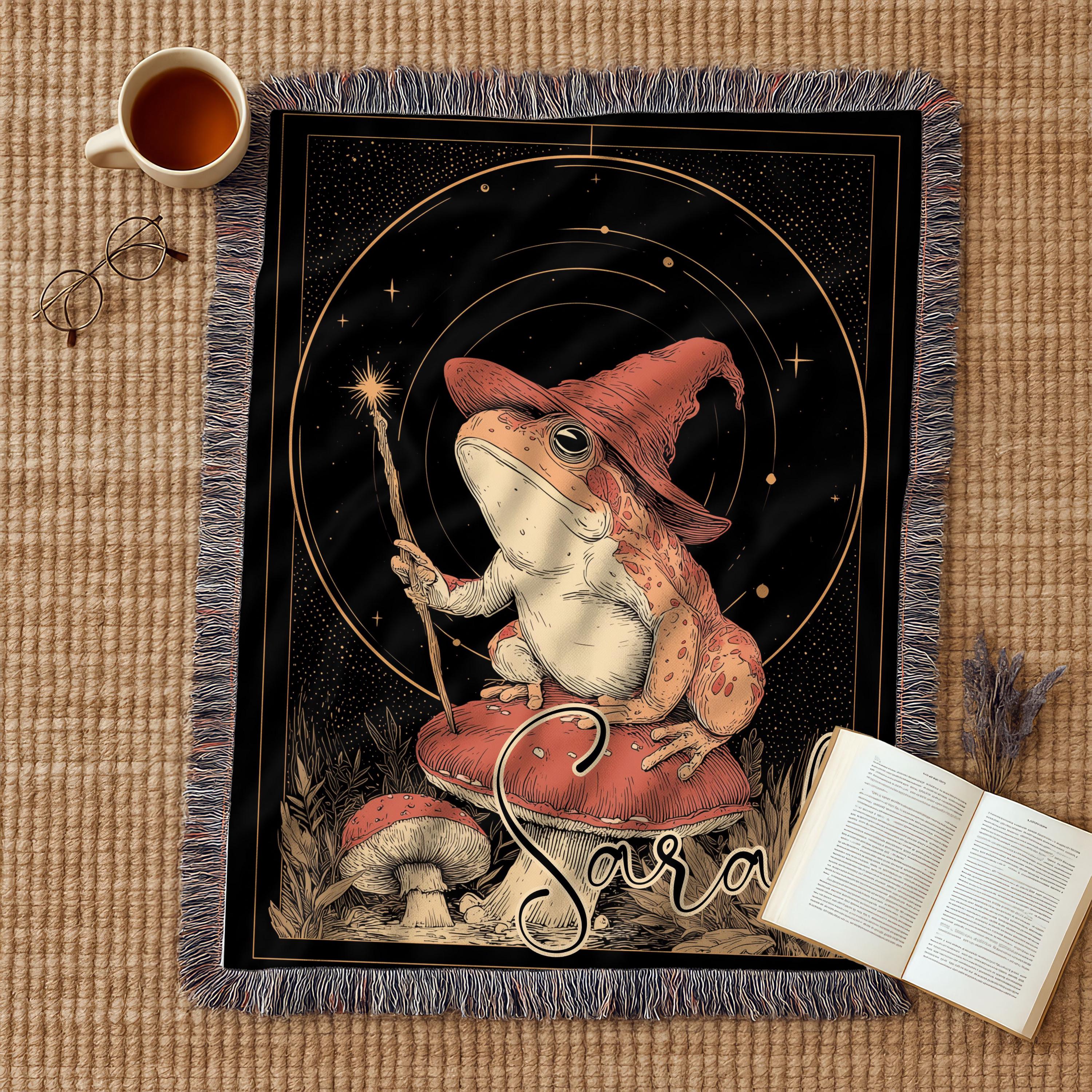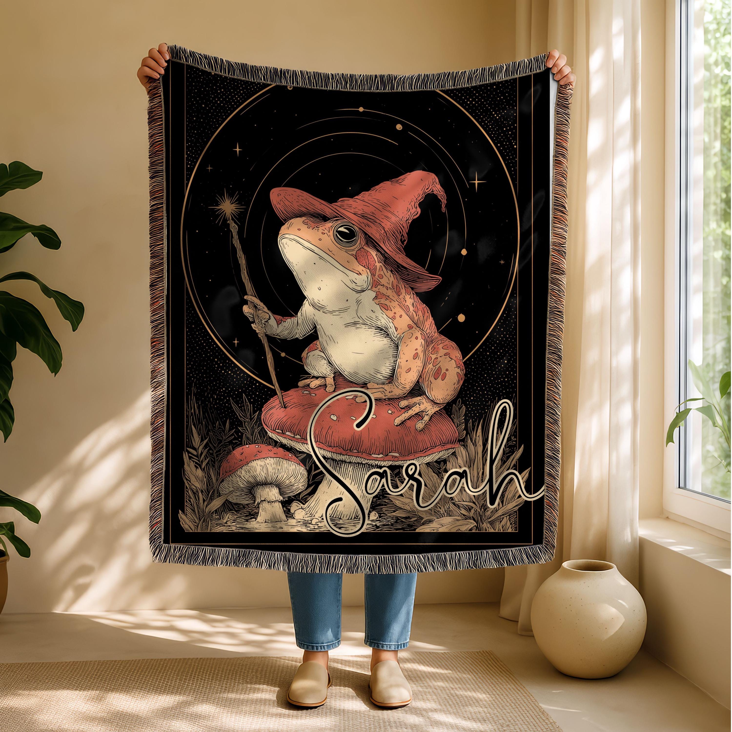 Wizard Frog Woven Blanket: Custom Name, Goblincore Blanket, Enchanted Woodland Decor