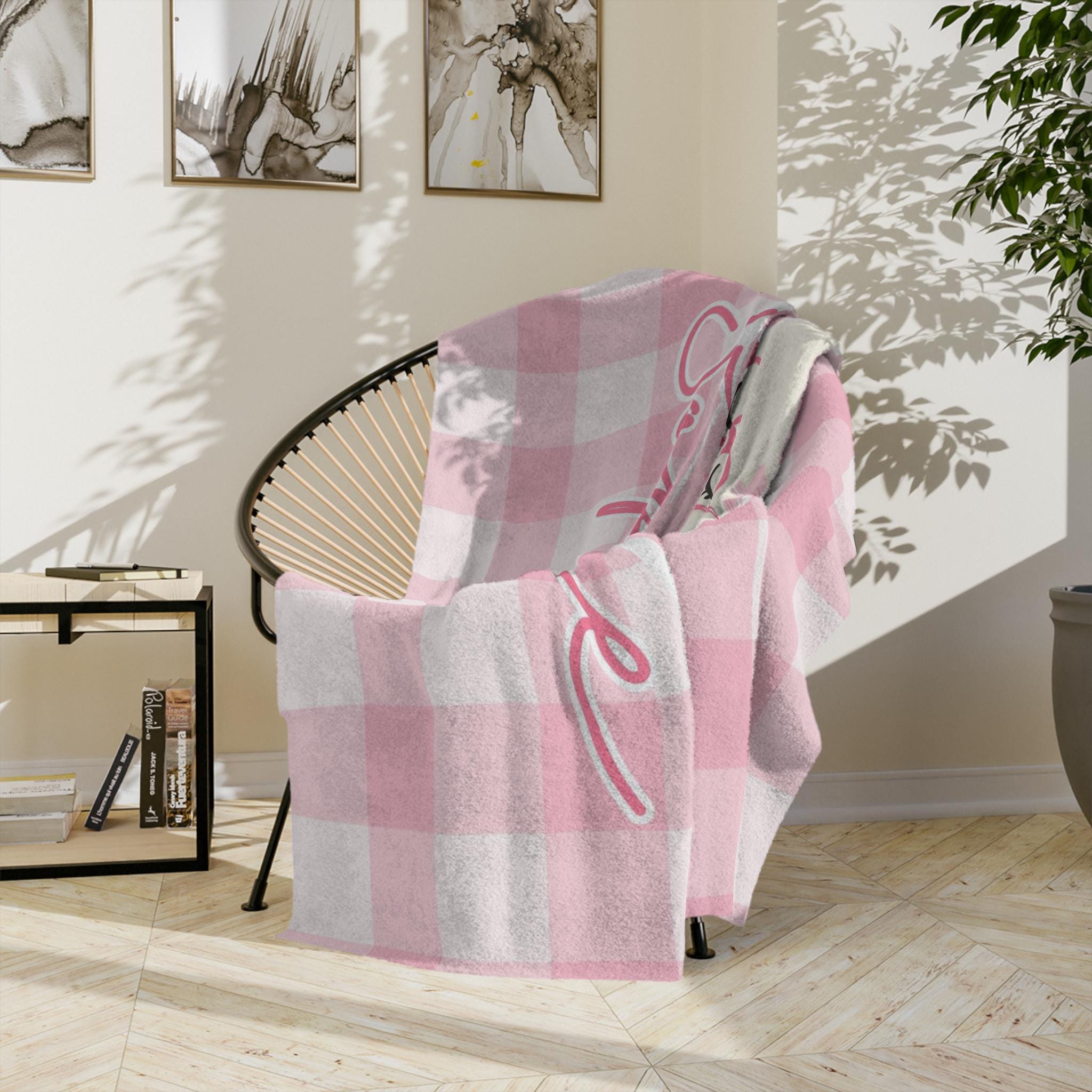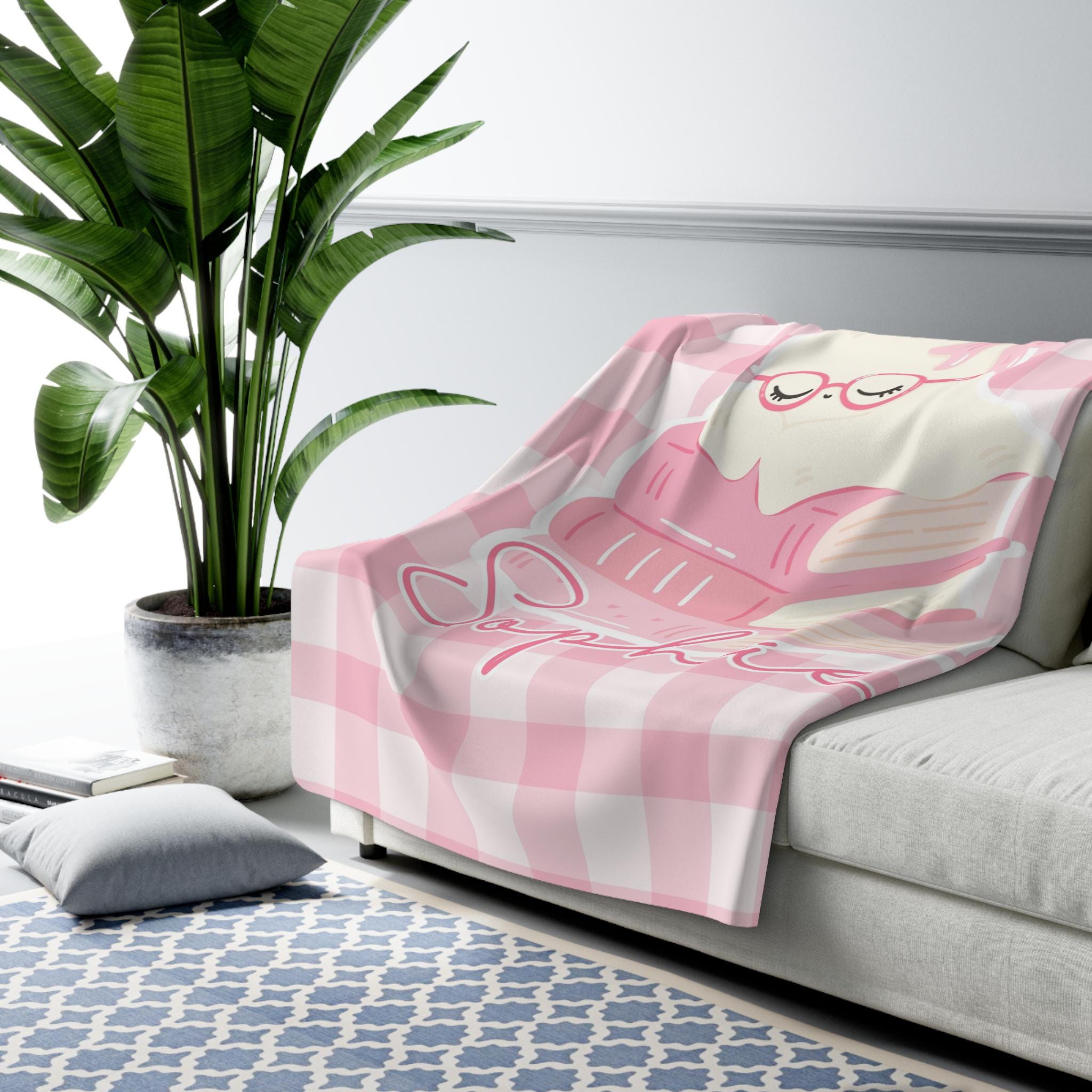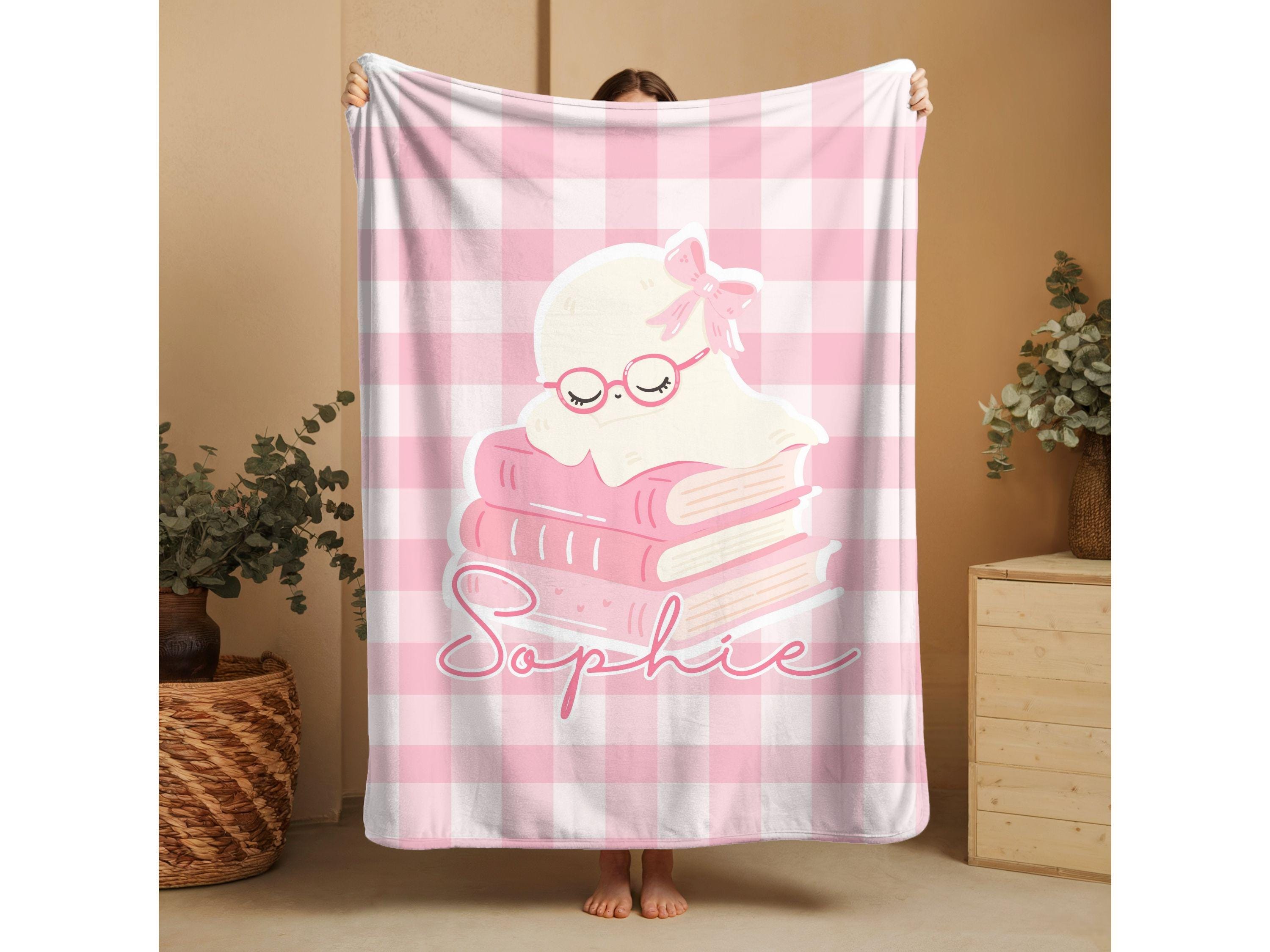 Pink ghost with books blanket customized with your baby's name — perfect thoughtful gift for little girls.