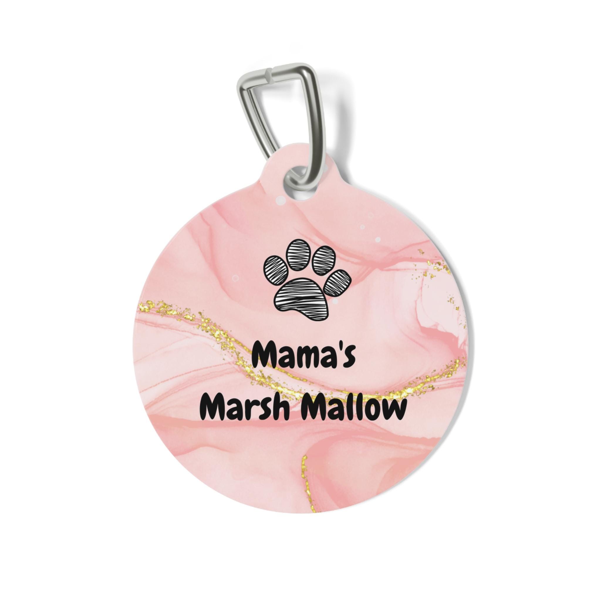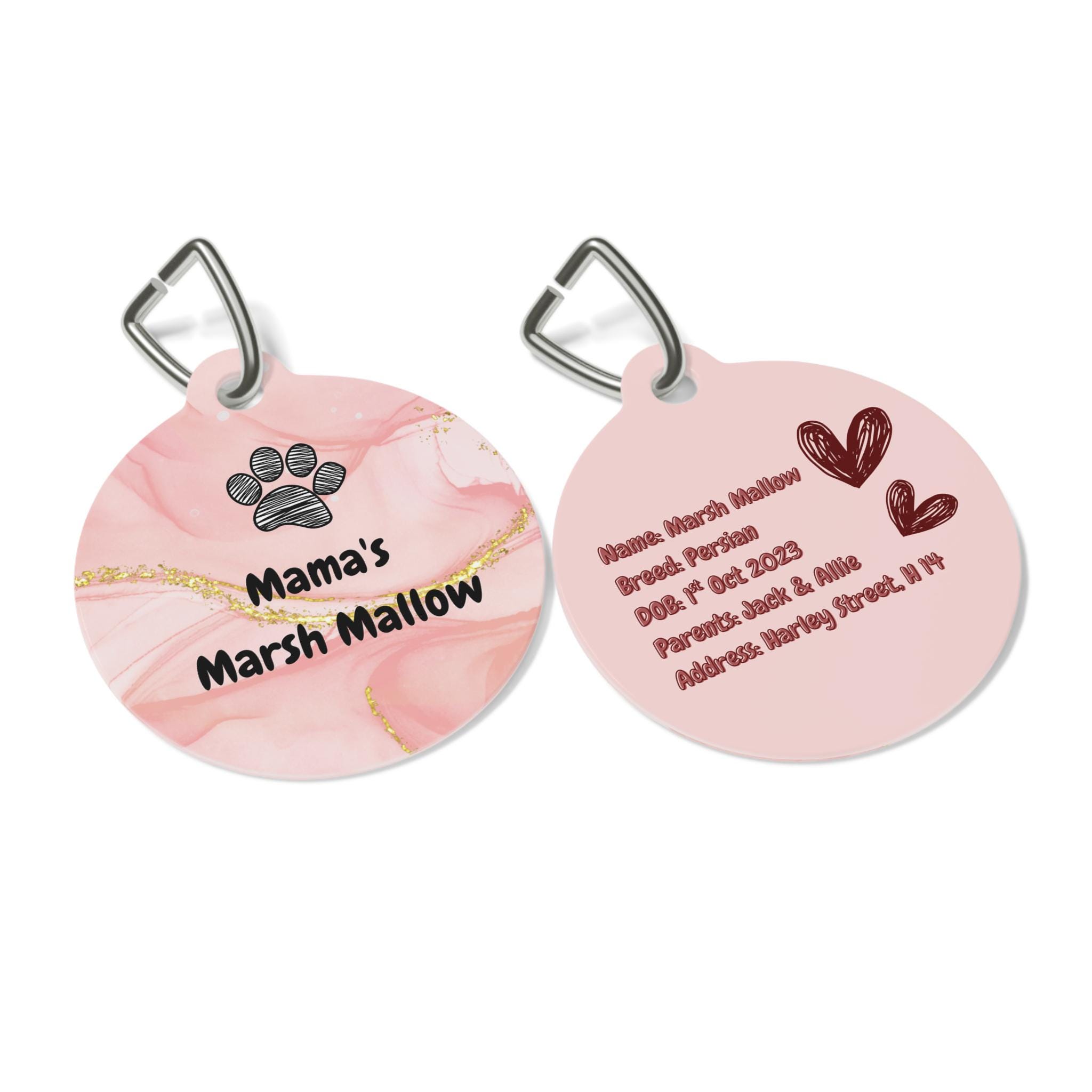 The elegant pink marble design with gold swirls and paw print accent adds a touch of luxury, making it ideal for both cats and dogs. Crafted from durable material and printed with high-quality detail, this tag isn’t just cute – it’s built to last.