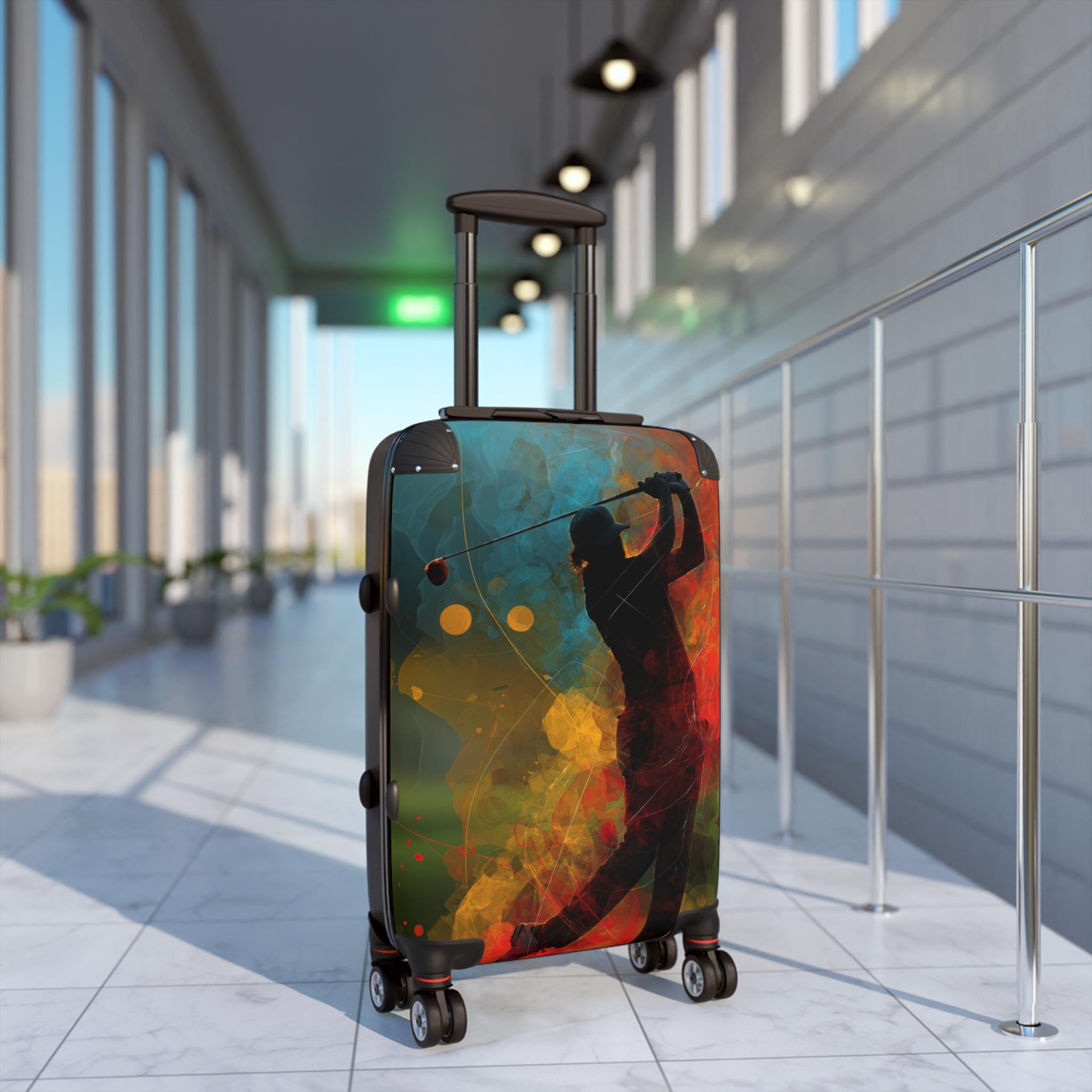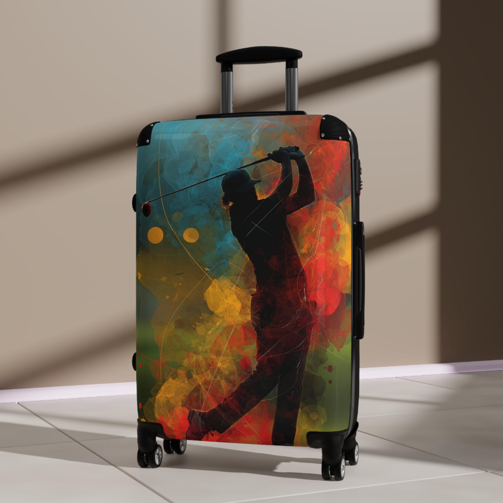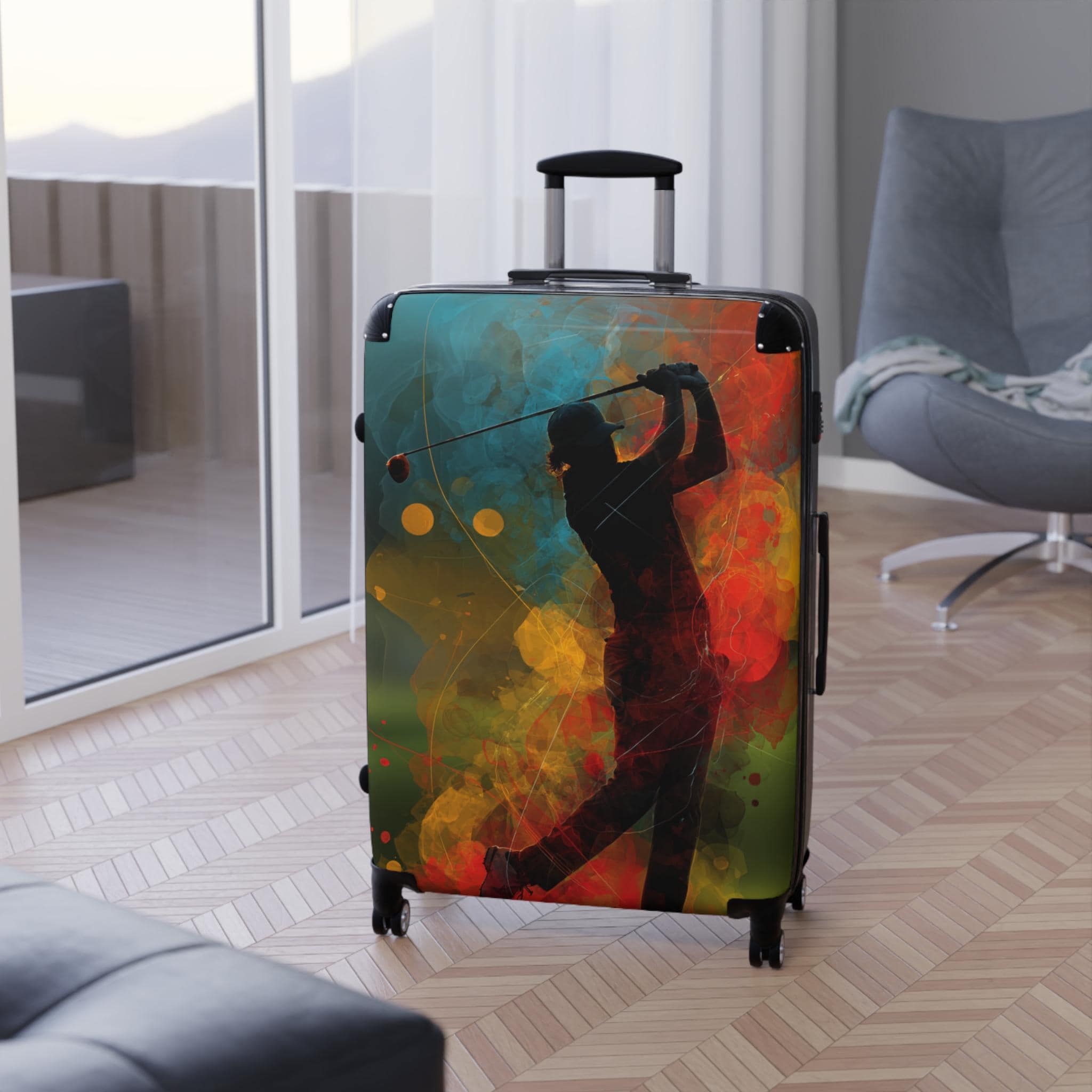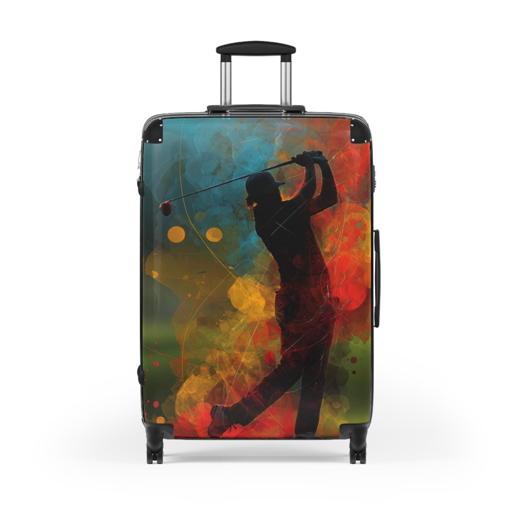 Travel in style with this bold and artistic golf suitcase, featuring a stunning silhouette of a golfer surrounded by dynamic color splashes. It’s not just luggage — it’s a statement piece for golf lovers who live the game both on and off the course.