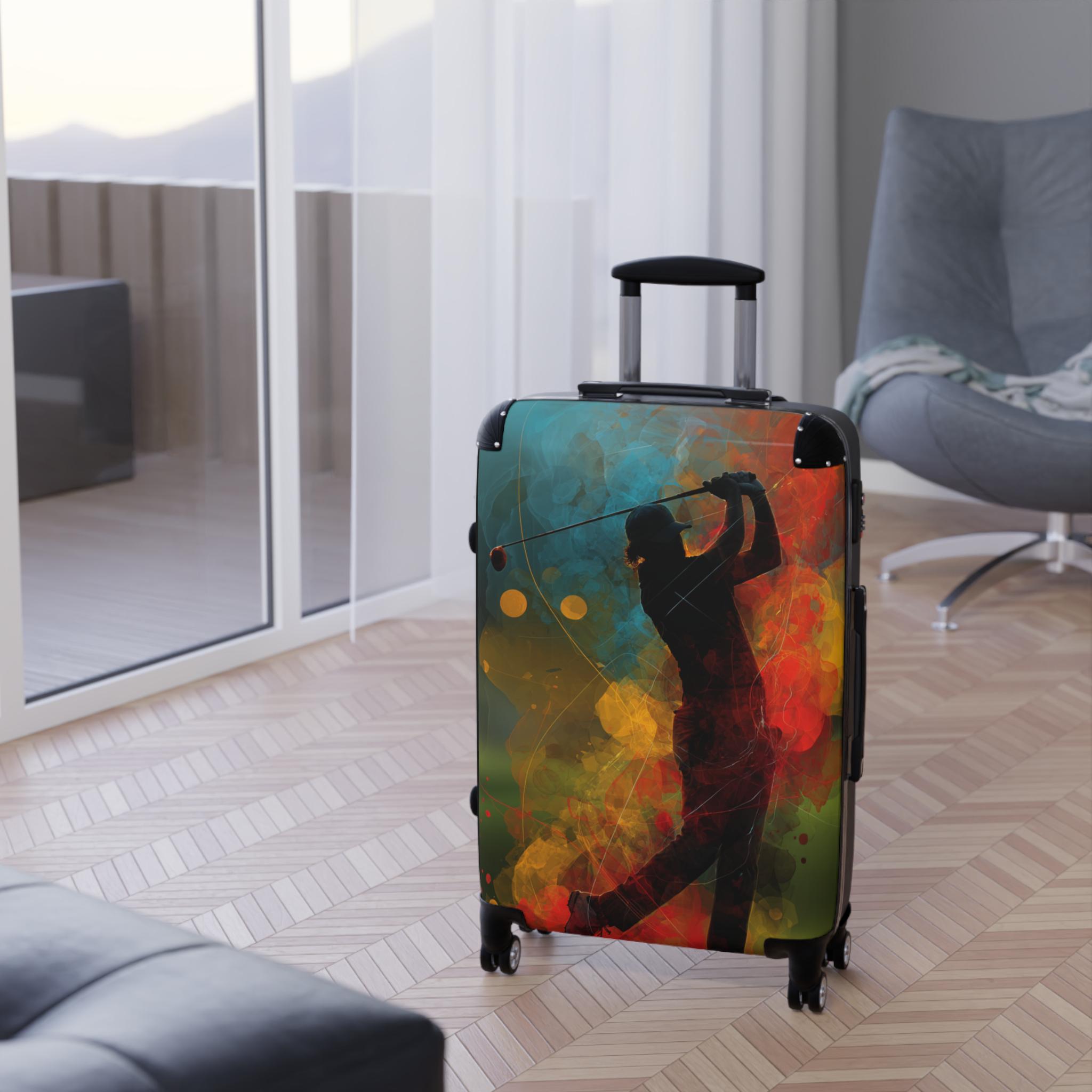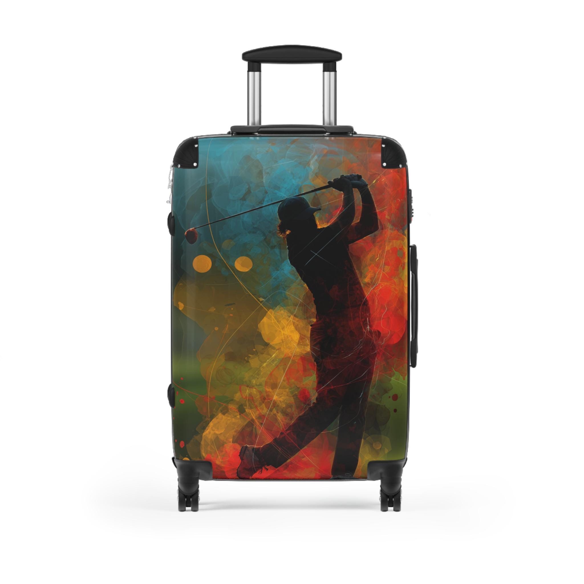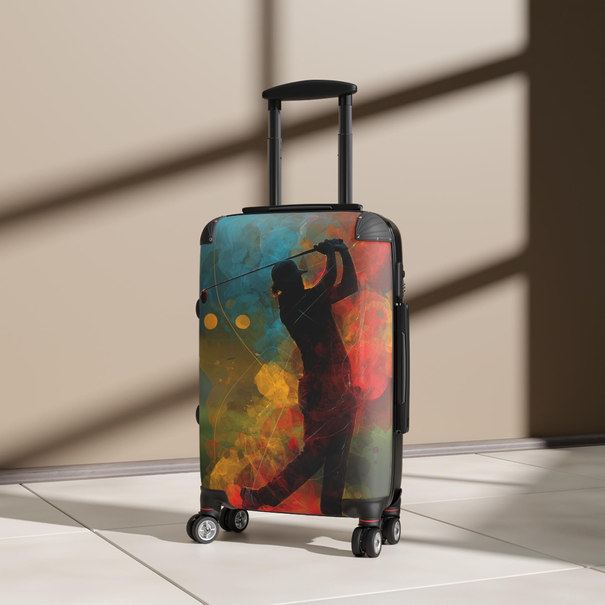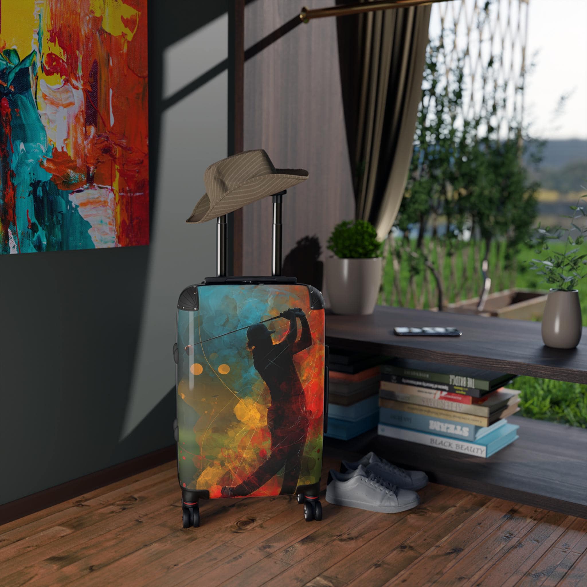 Travel in style with this bold and artistic golf suitcase, featuring a stunning silhouette of a golfer surrounded by dynamic color splashes. It’s not just luggage — it’s a statement piece for golf lovers who live the game both on and off the course.