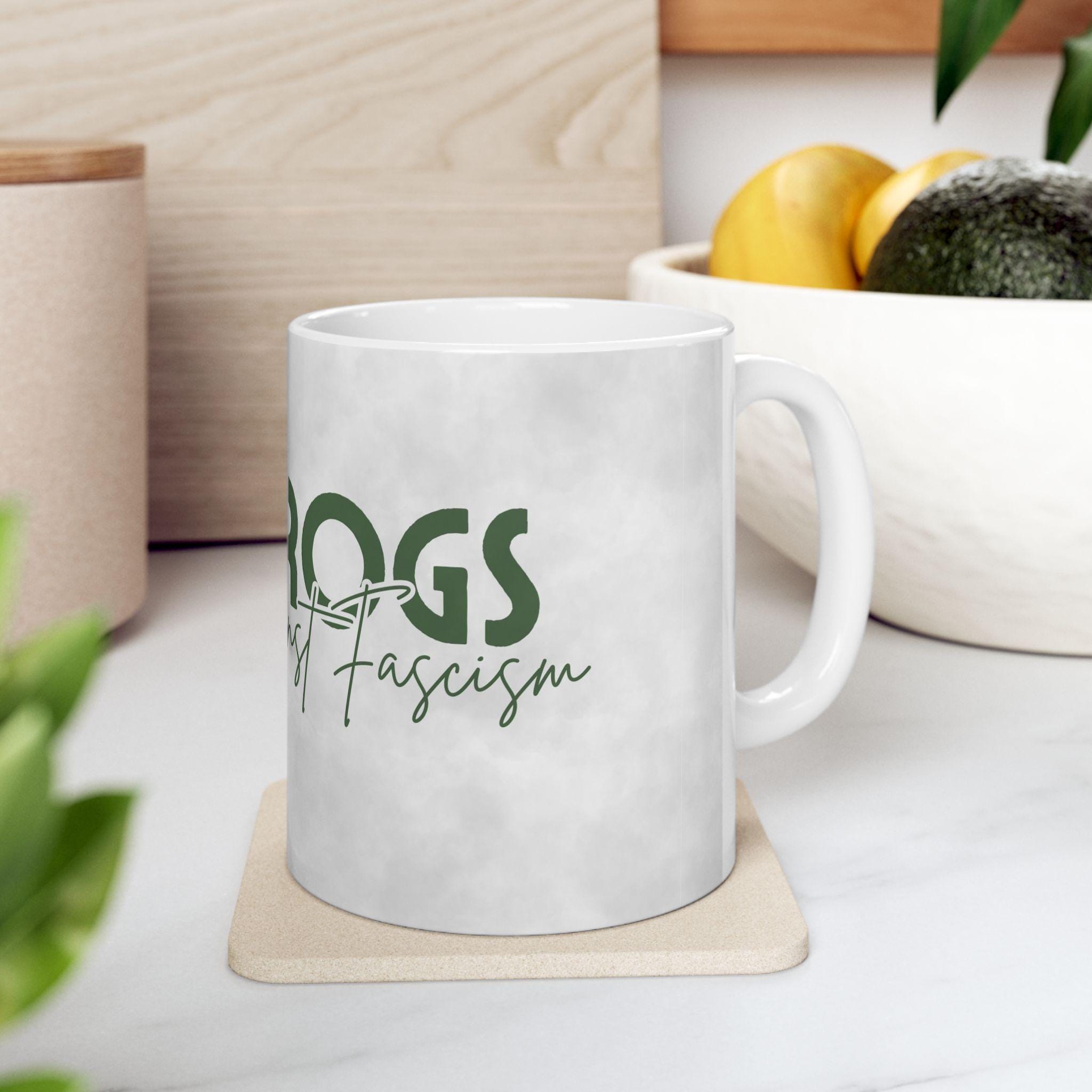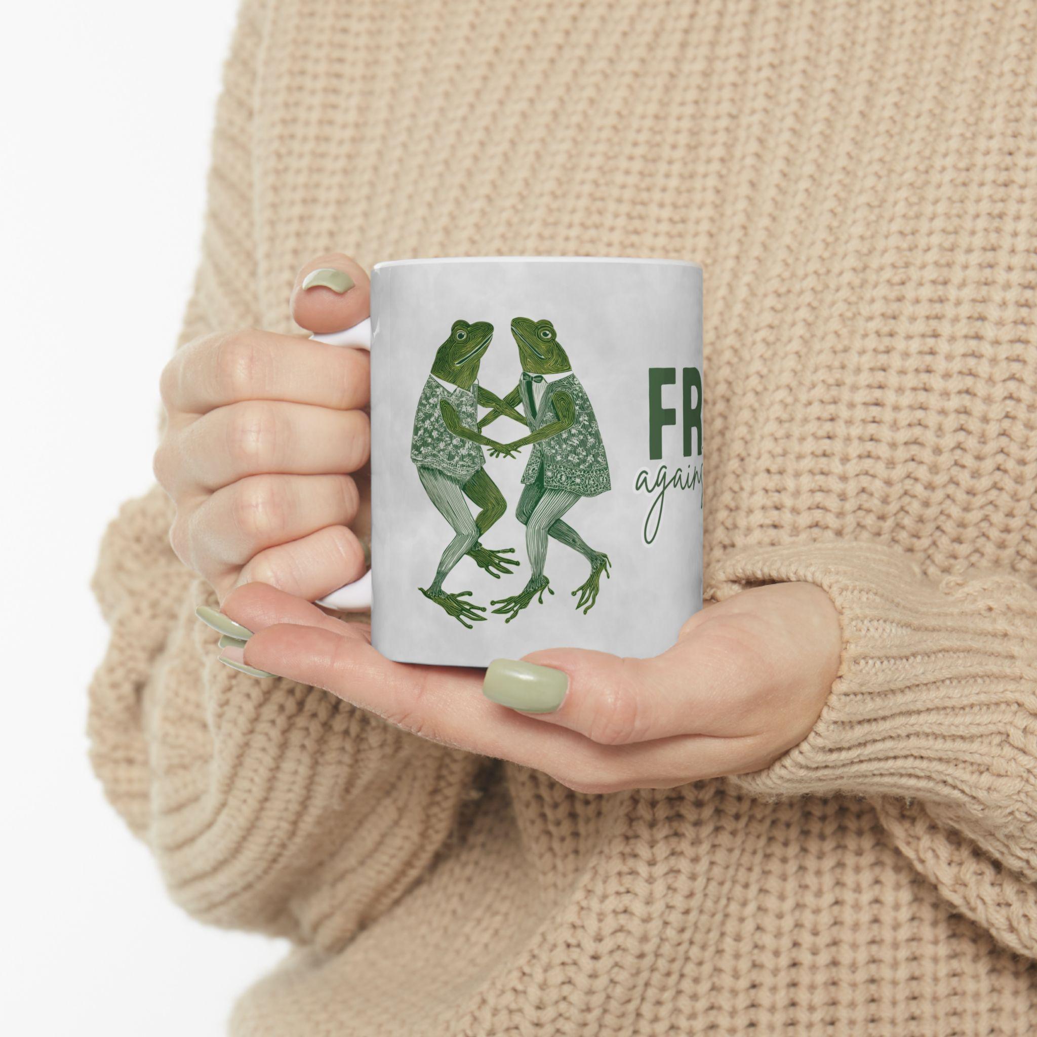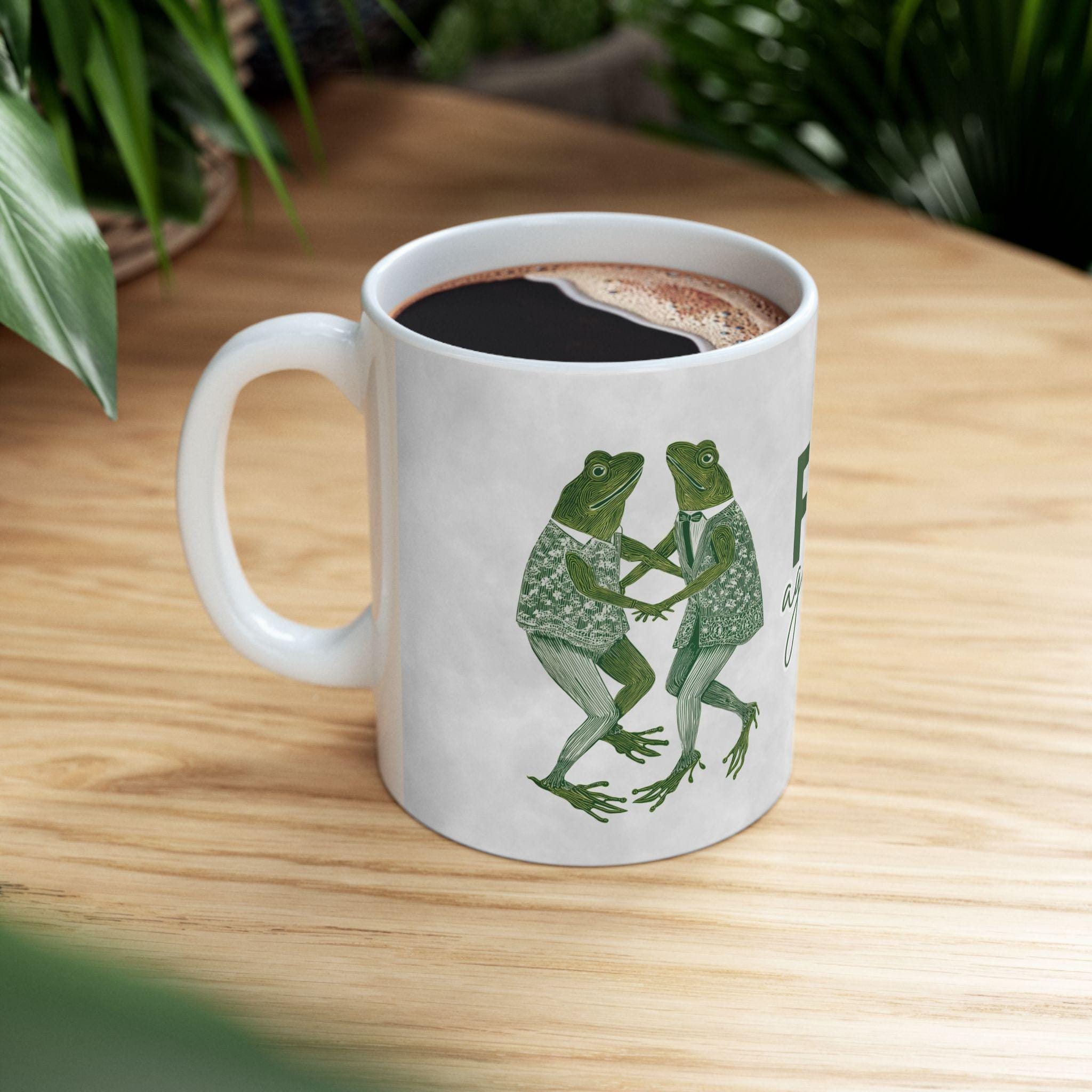 Social justice and frogs against fascism! This funny frog mug blends cottagecore charm with goblincore humor, featuring a quirky frog and toad design that stands for equal rights and good vibes. Perfect as a gag gift, coworker gift, or gift for him, this frog coffee cup comes in both 11oz and 15oz sizes for your favorite brew.
