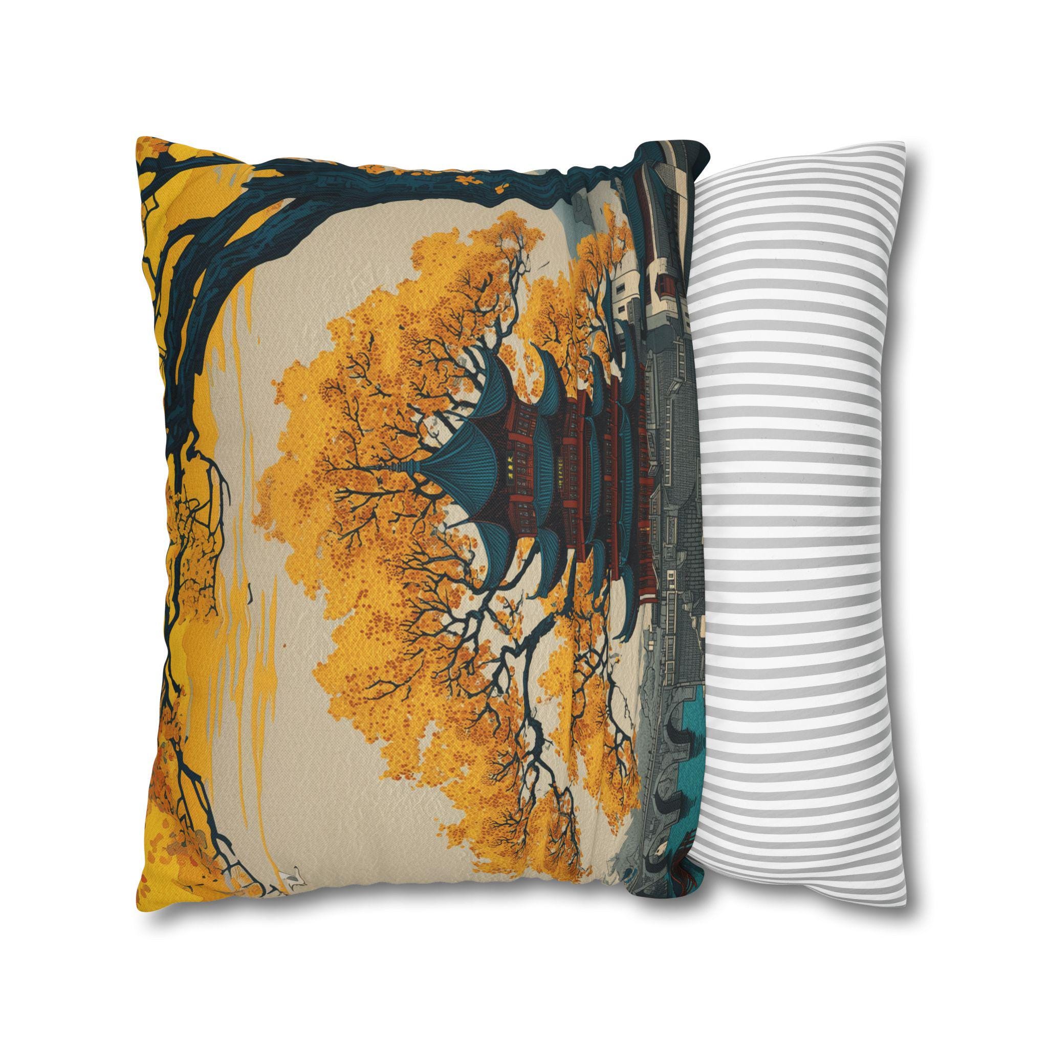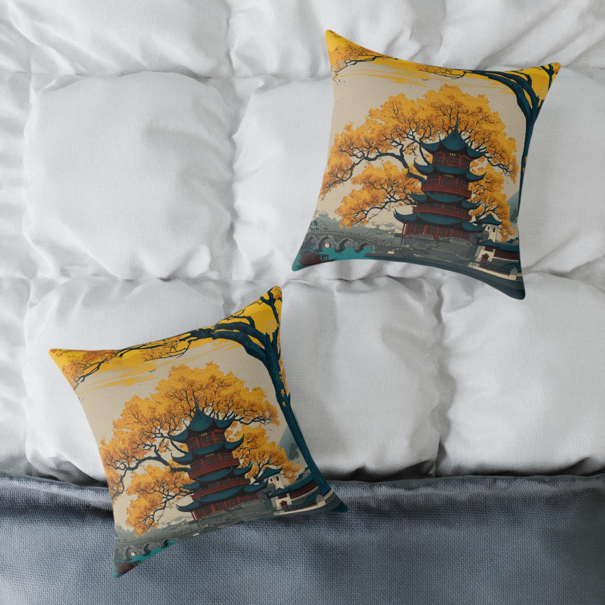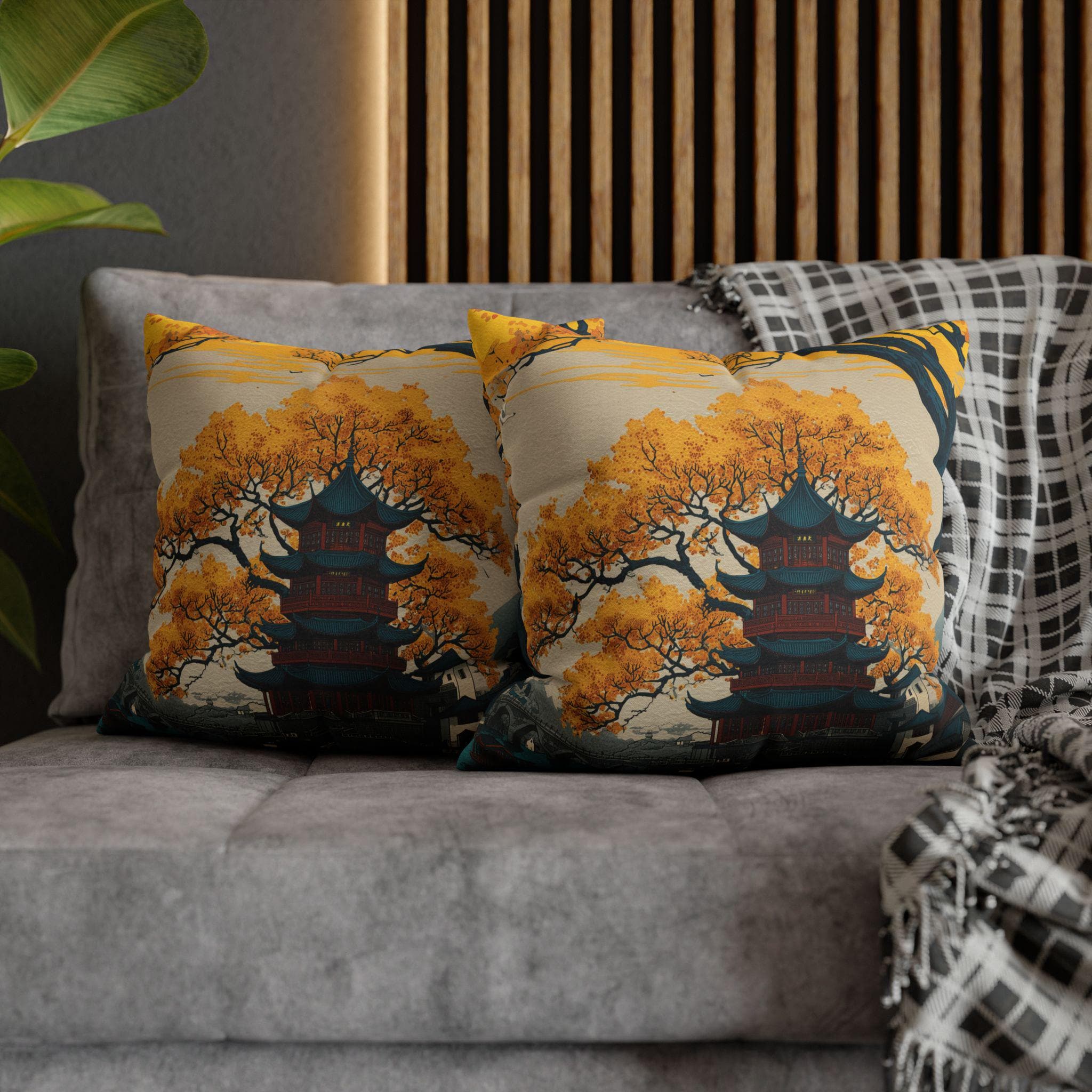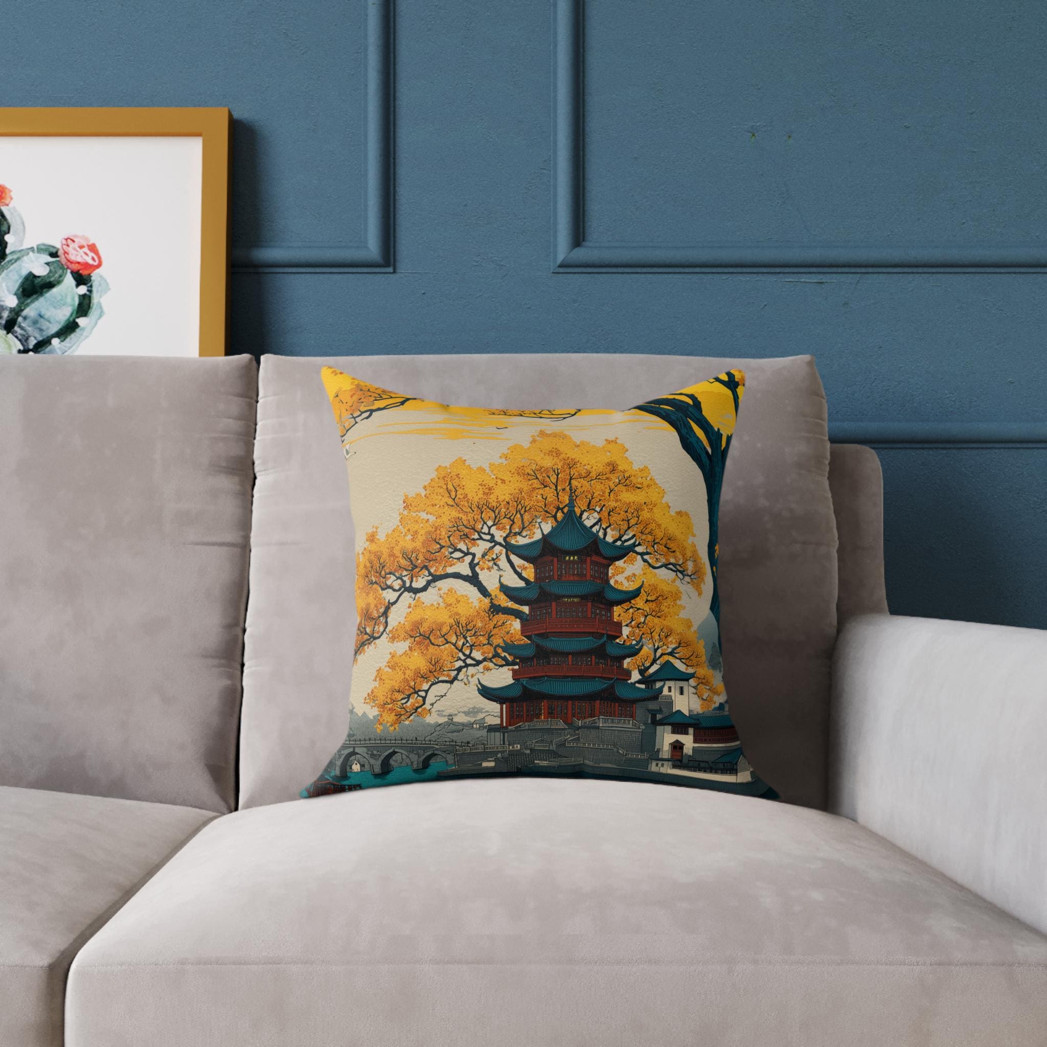 Bring timeless elegance to your space with this striking chinoiserie cushion / cushion cover featuring a traditional East Asian pagoda surrounded by golden autumn foliage. The rich colors and intricate design create a perfect blend of culture, art, and seasonal warmth, making this piece a standout in any room.