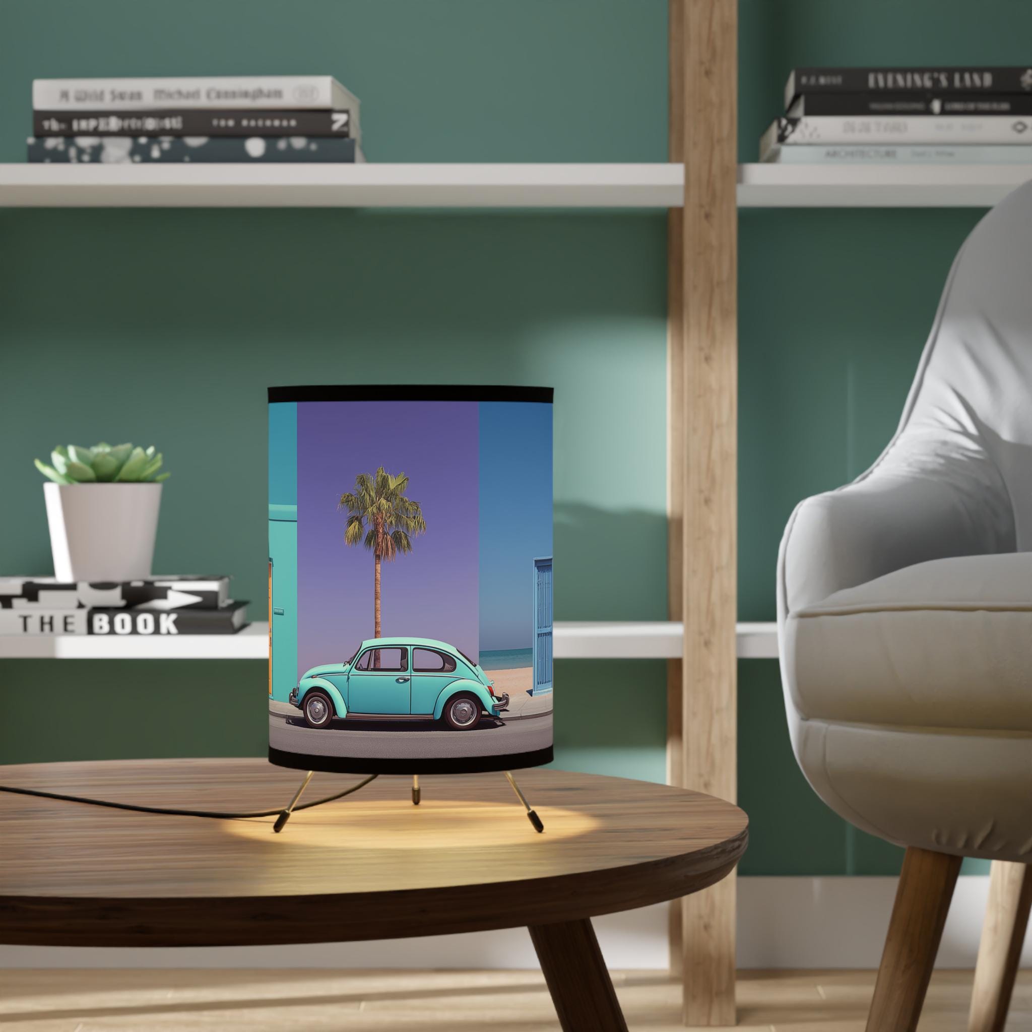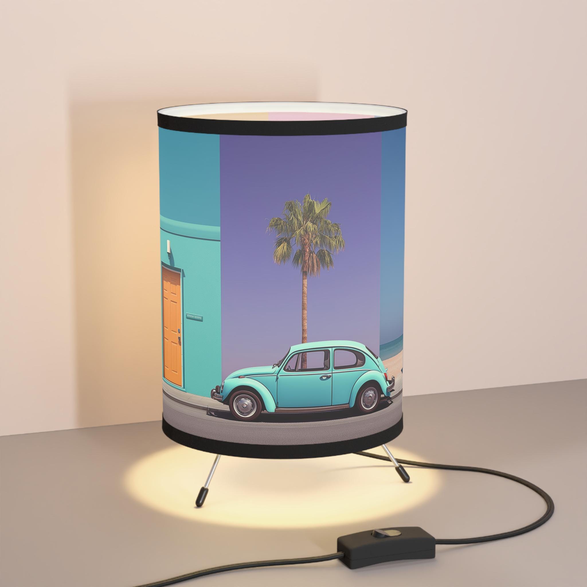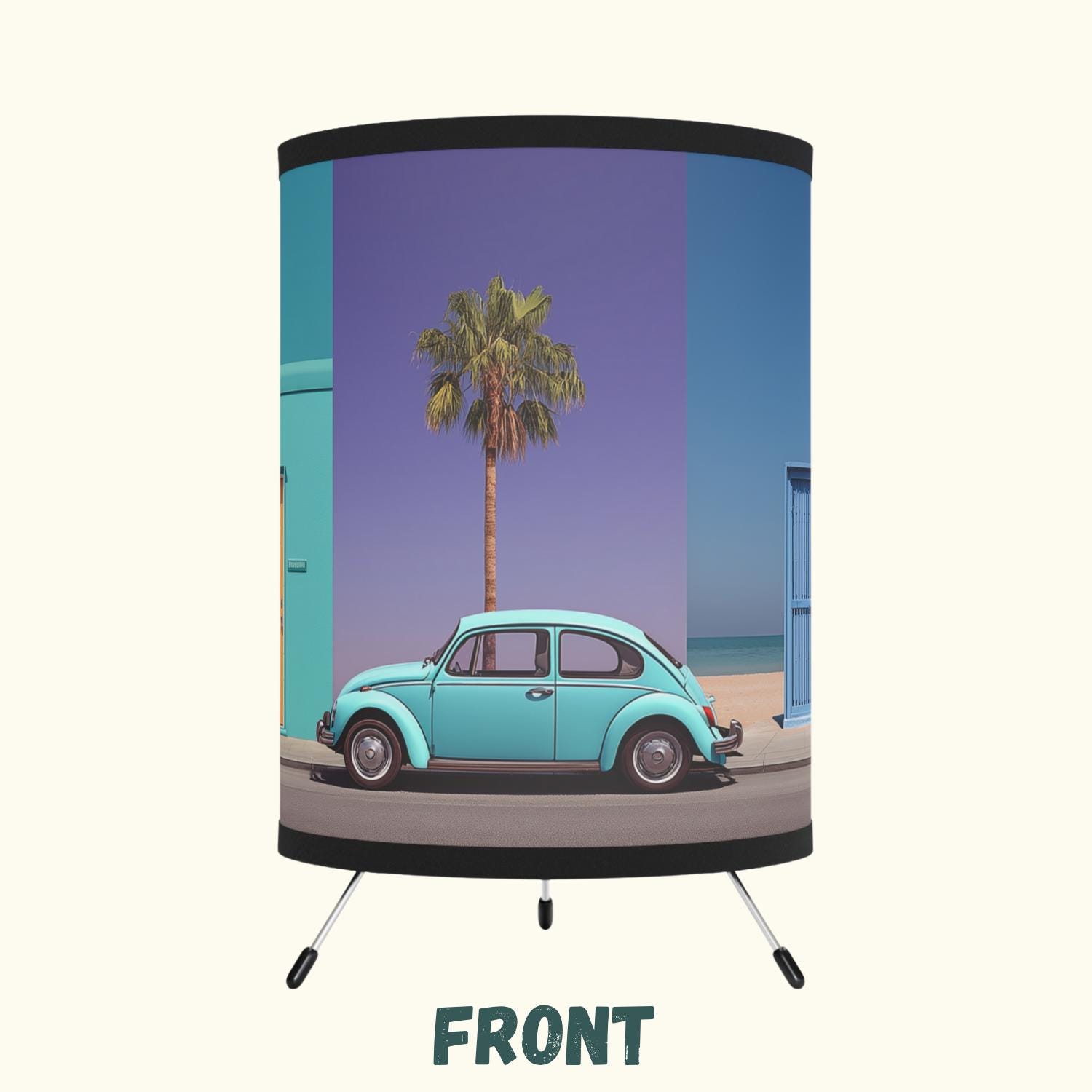 Retro Coastal Tripod Lamp, Vintage Car & Palm Art Light, Mid-Century Modern Decor, Custom Mood Lamp, Colorful Home Accent Gift