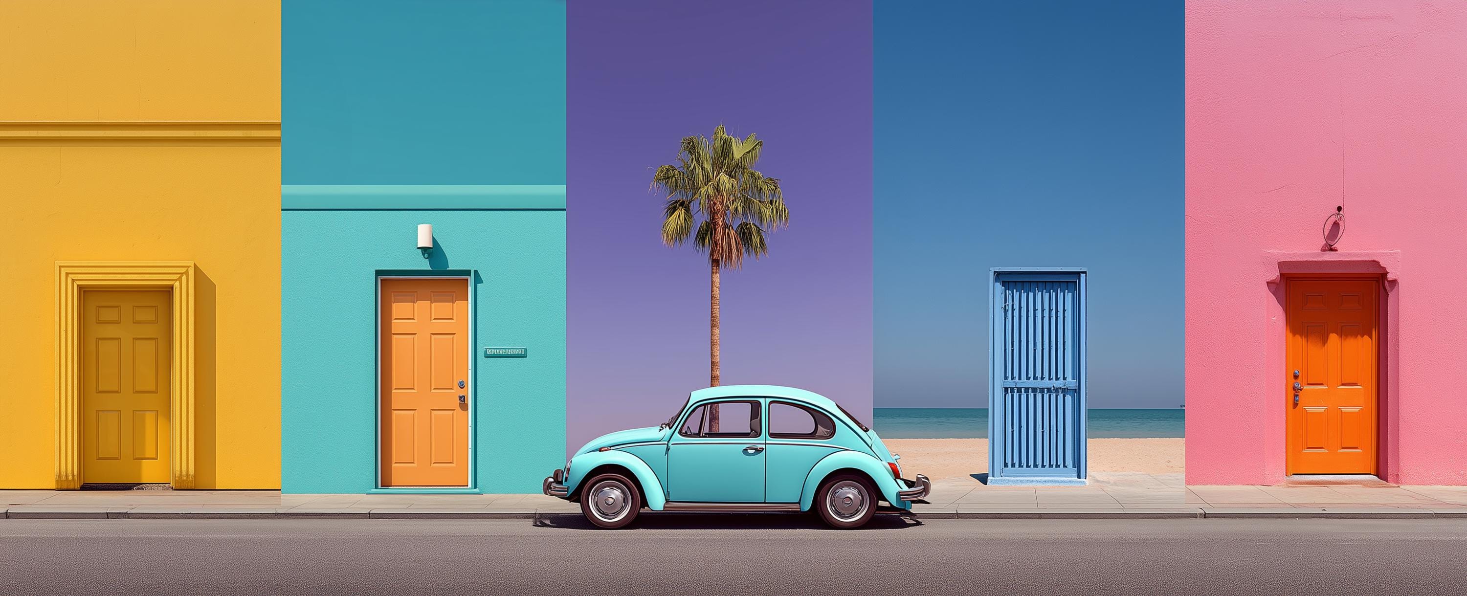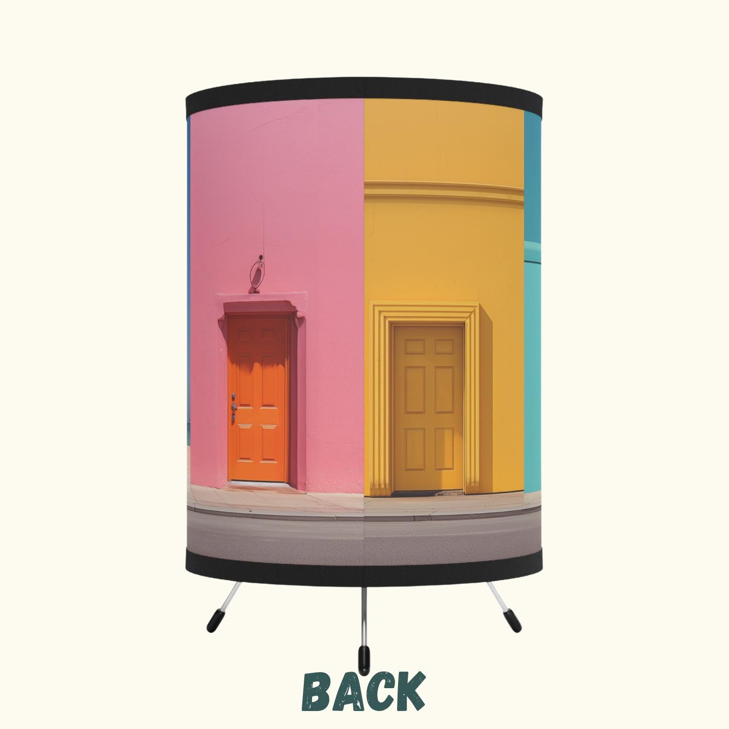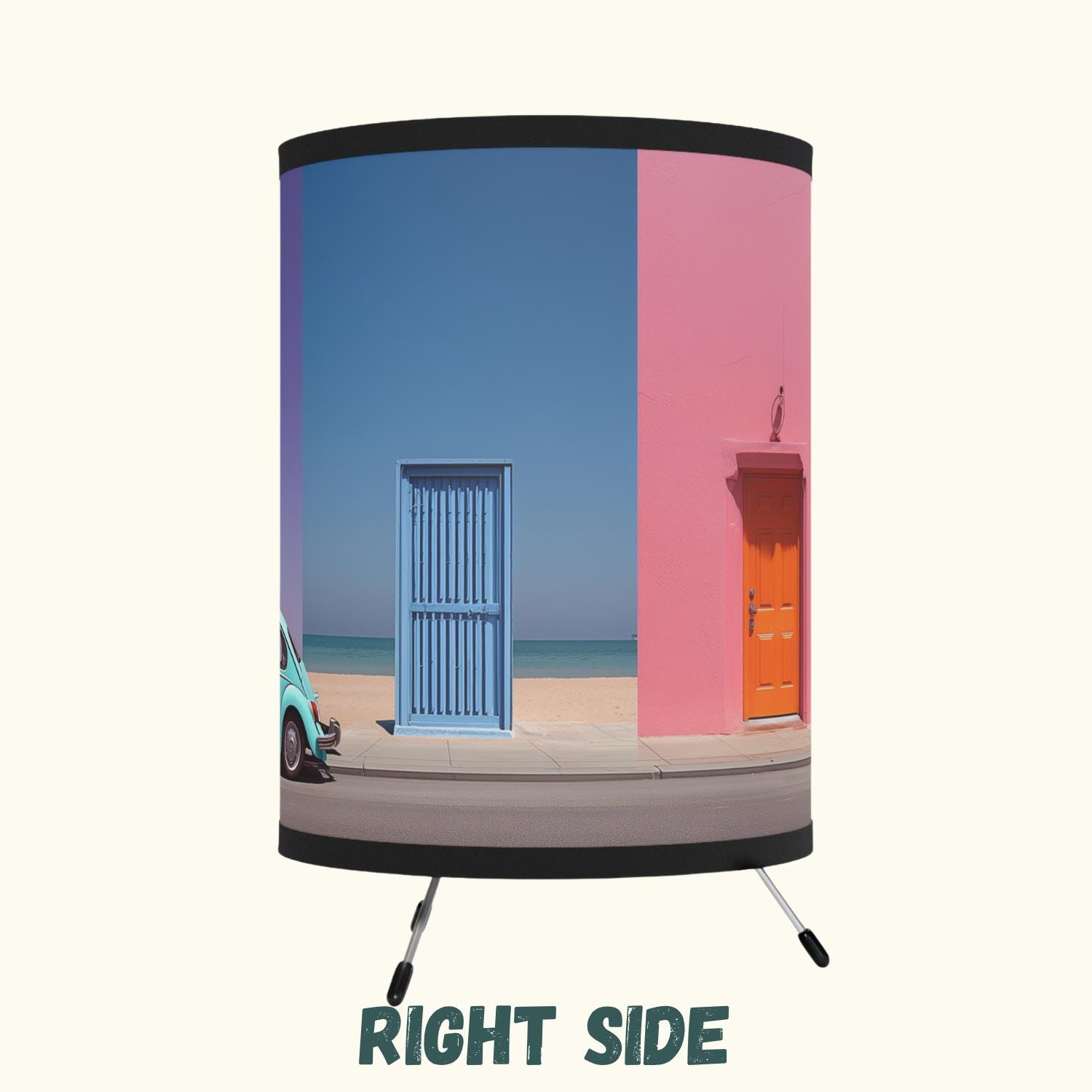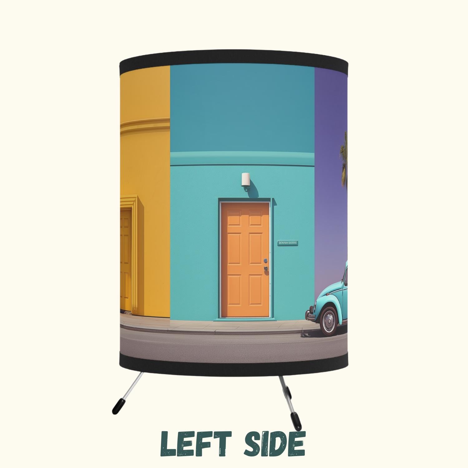 Illuminate your space with nostalgic charm — this Retro Coastal Tripod Lamp captures sun-soaked vintage vibes in a modern, artful form. Featuring a pastel street scene with bold color blocks, a palm tree, and a vintage car by the beach, it’s a striking centerpiece for any room.