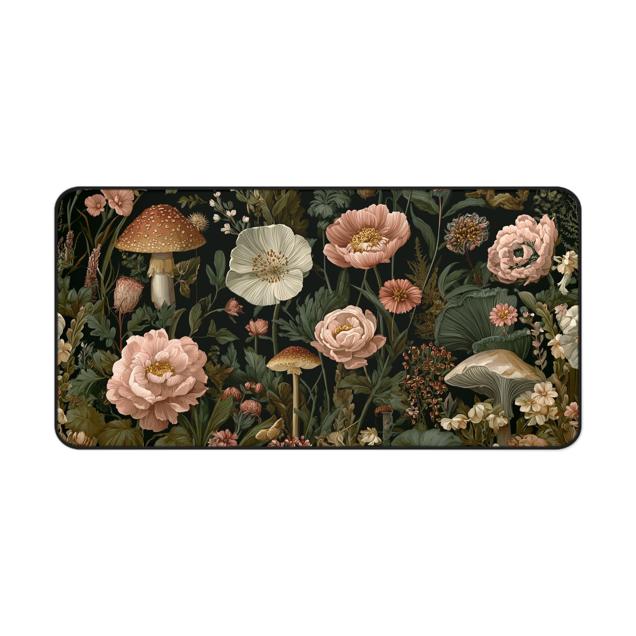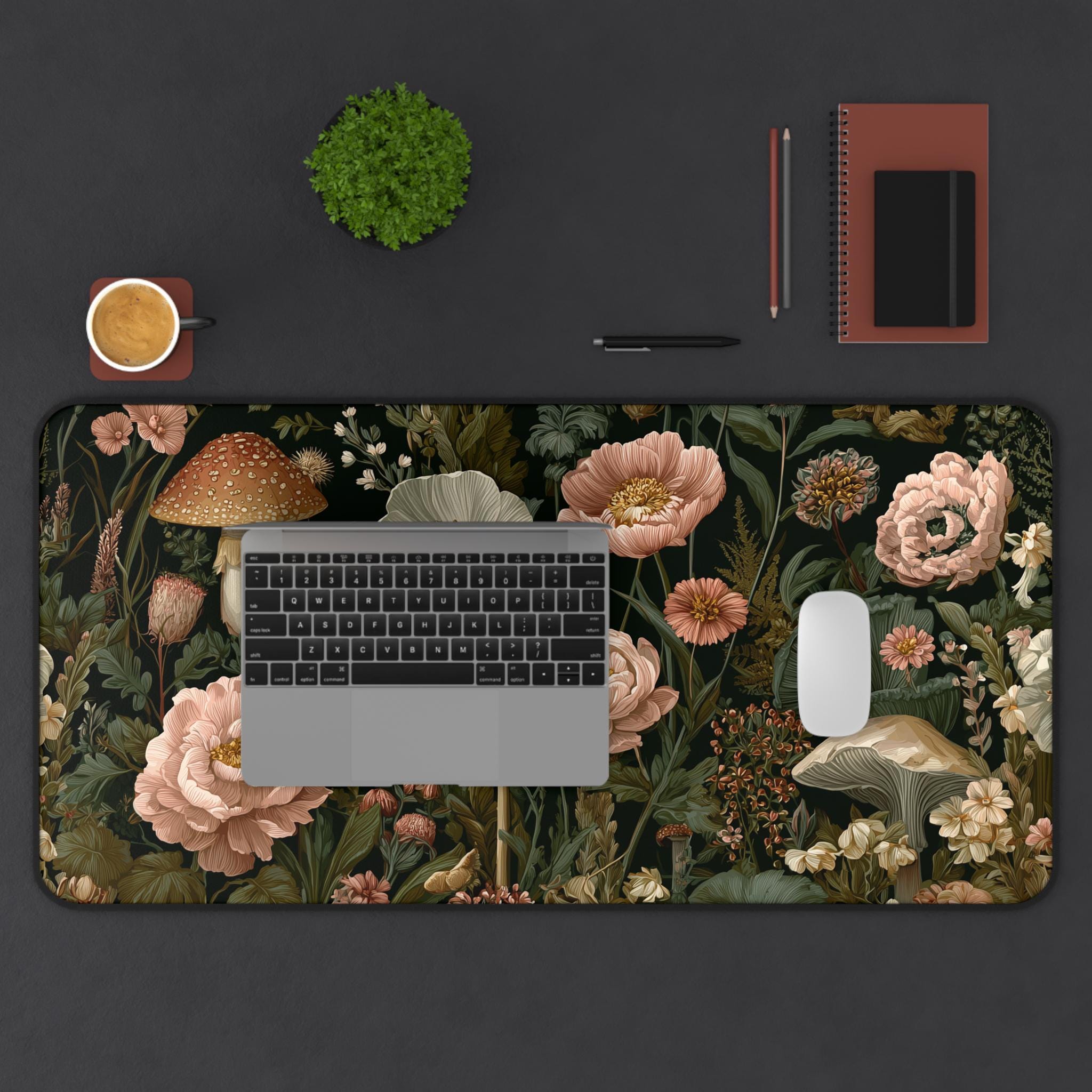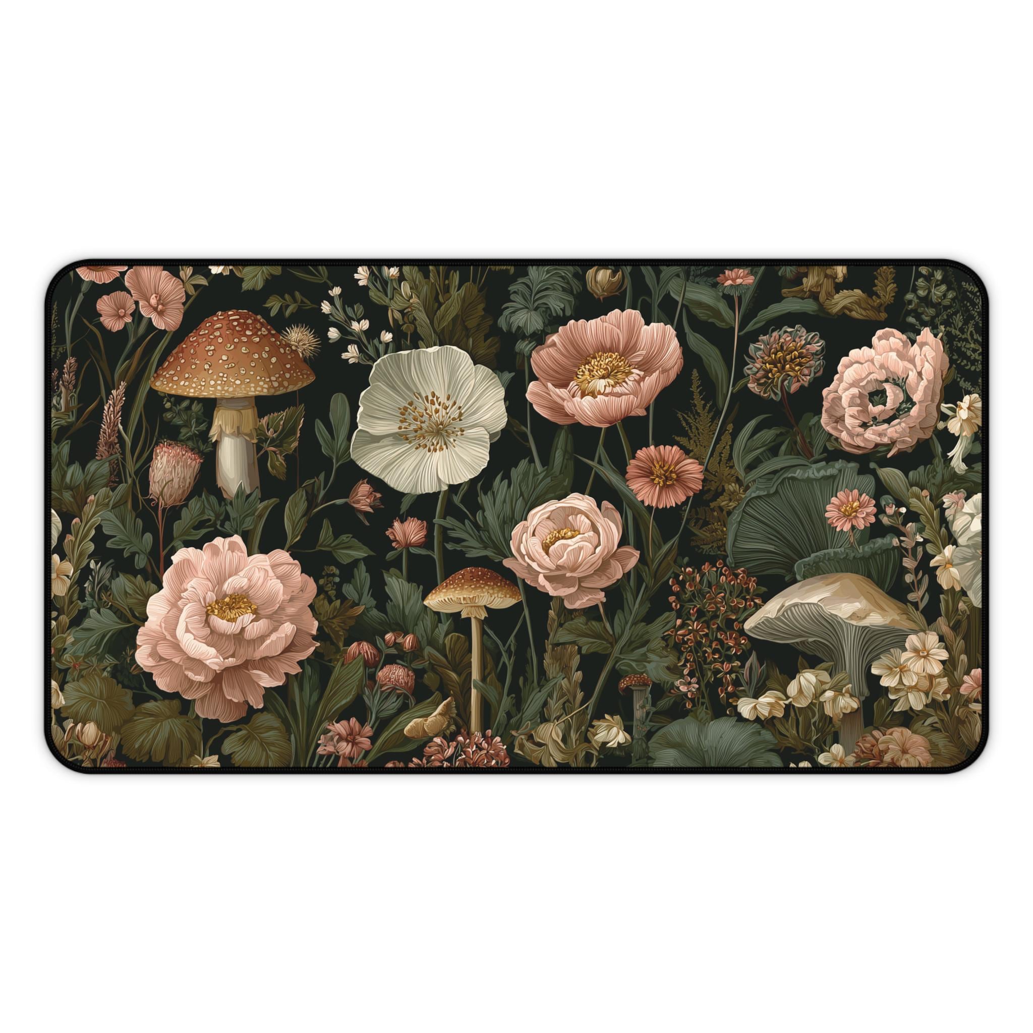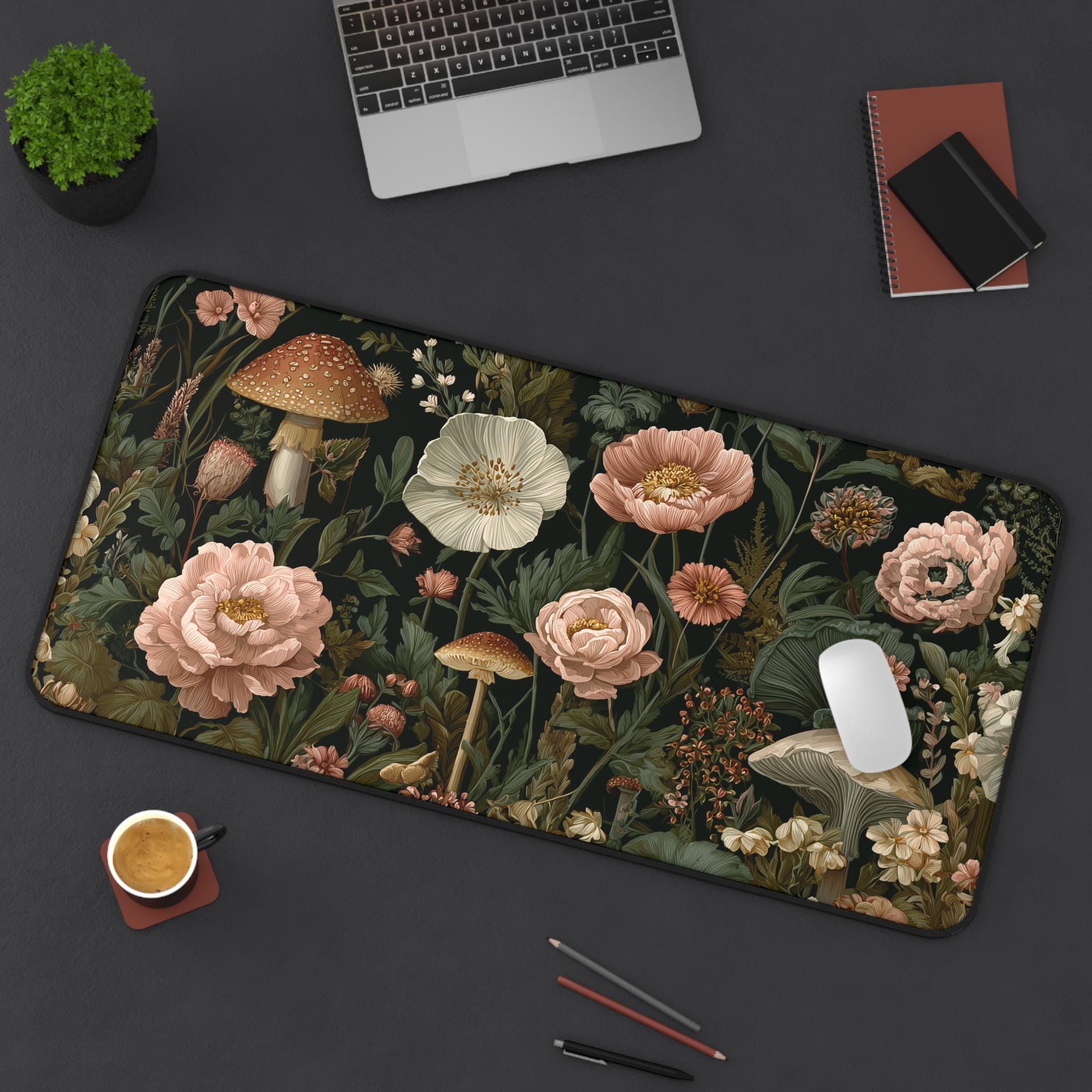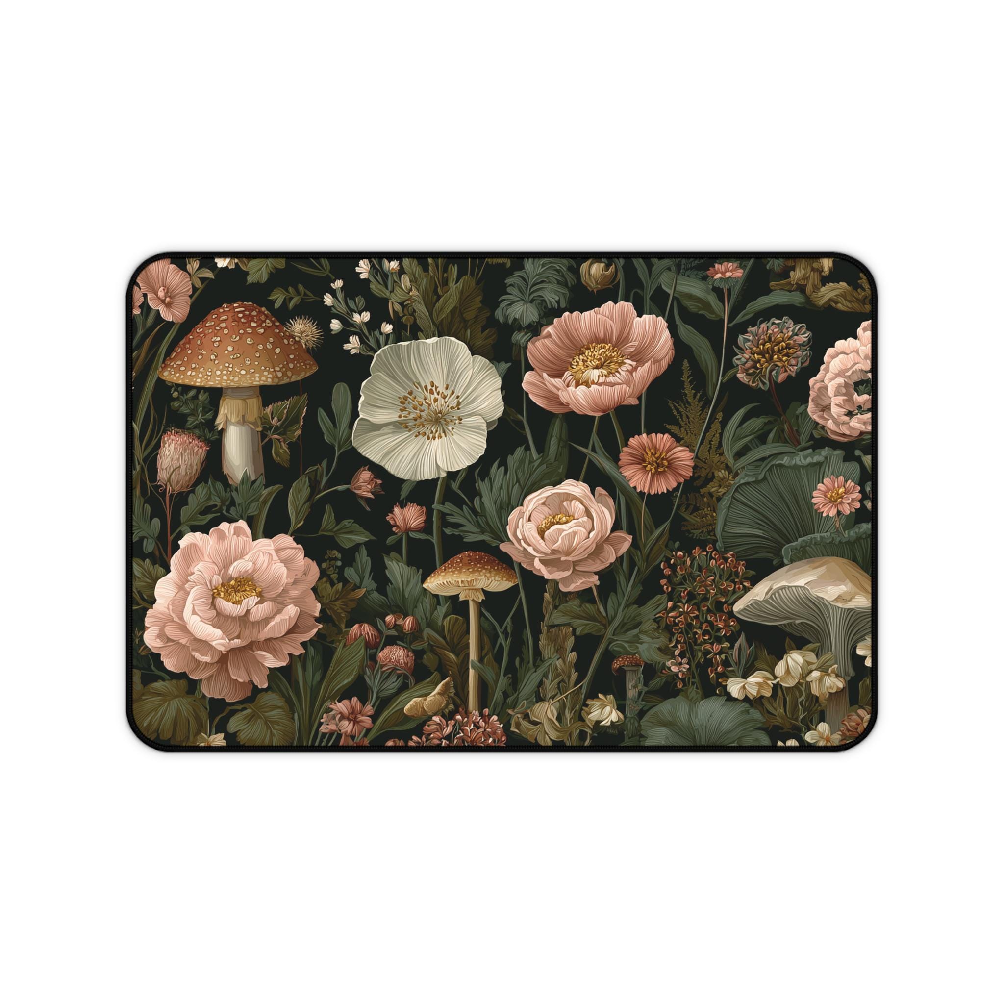 Dark Botanical Desk Mat, Mushroom Floral Mouse Pad, Cottagecore Office Decor, Vintage Aesthetic Desk Pad Gift for Workspace