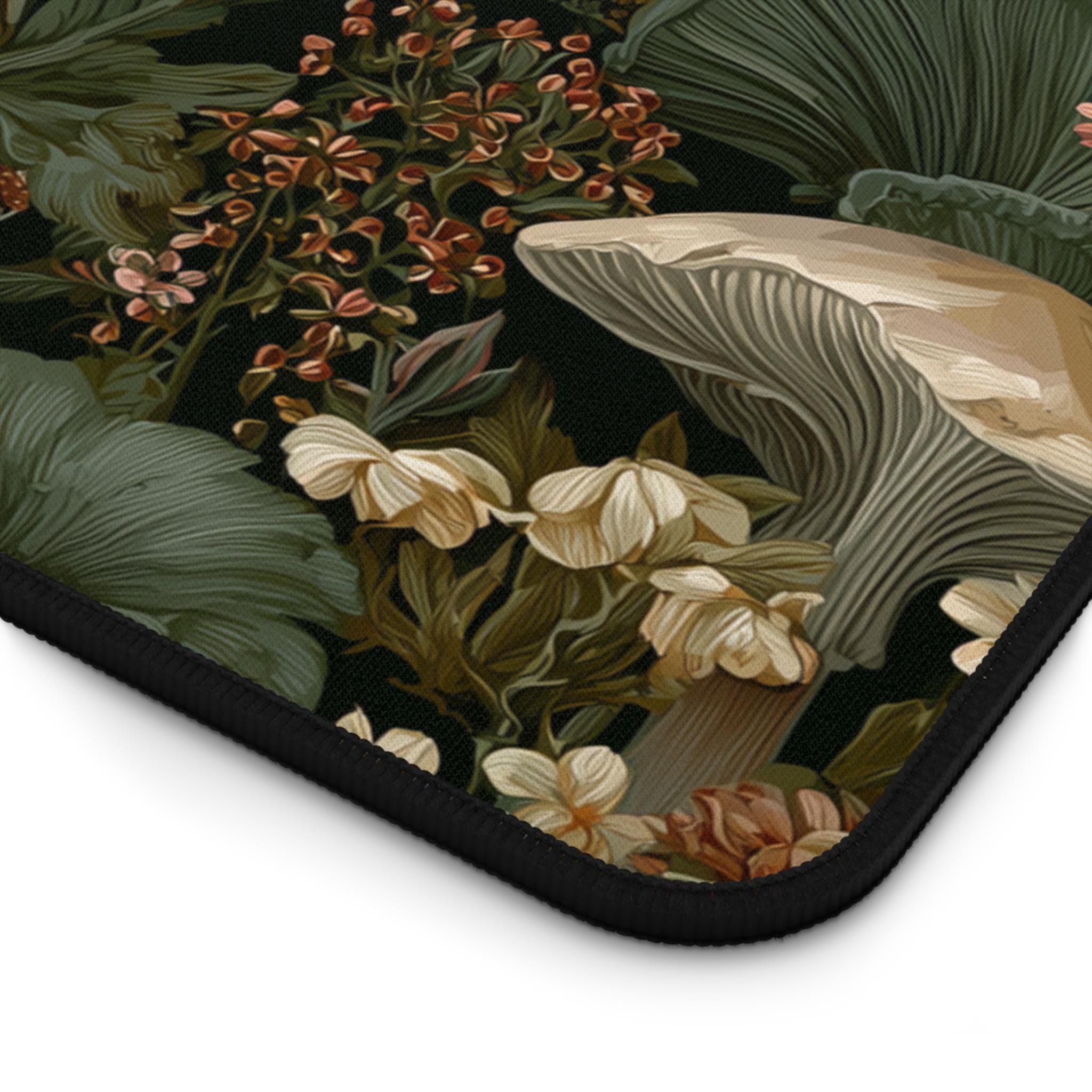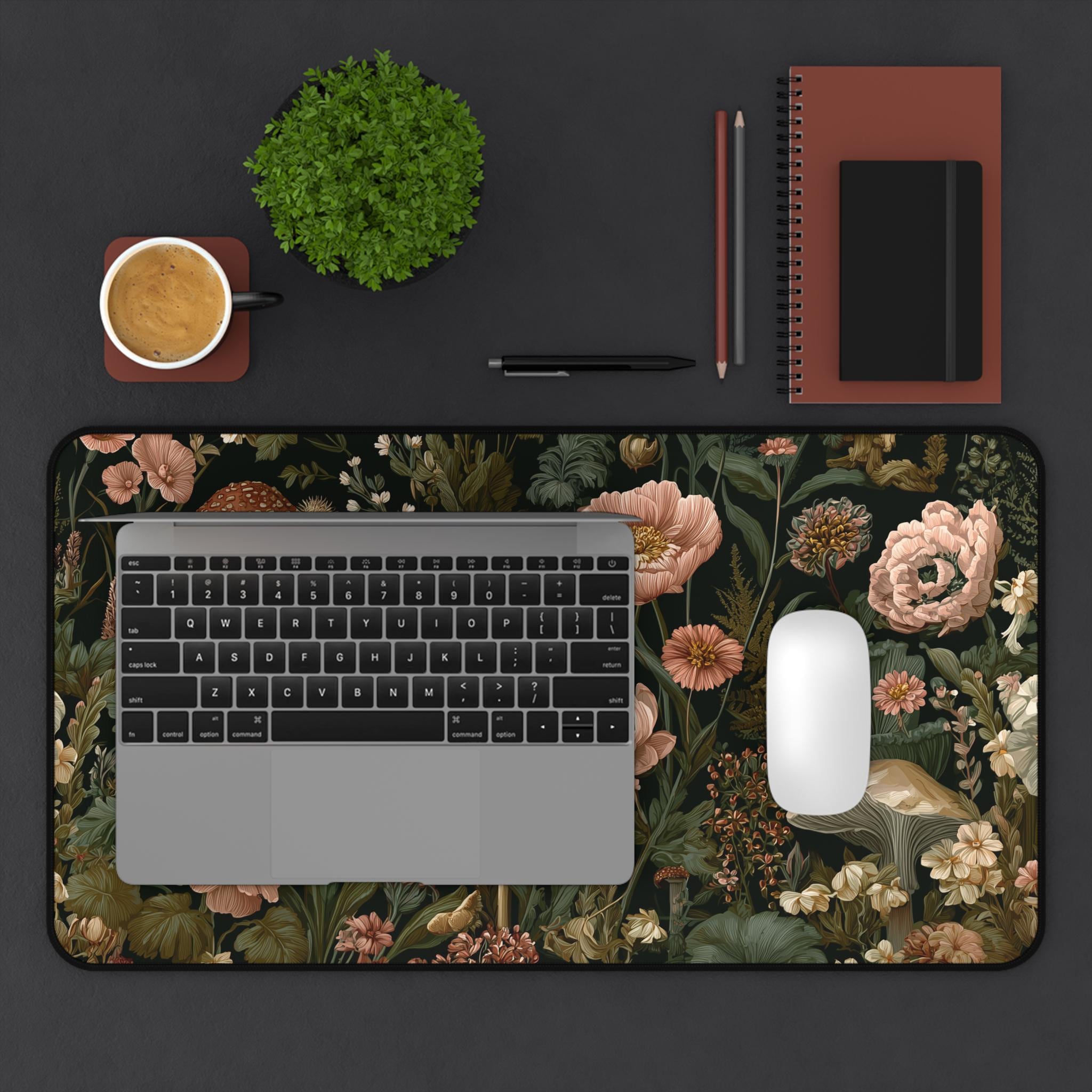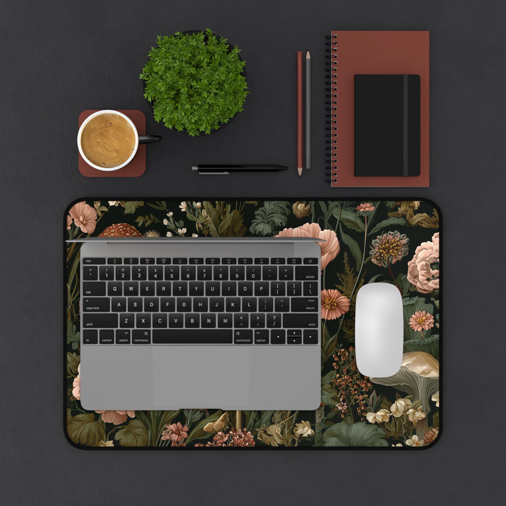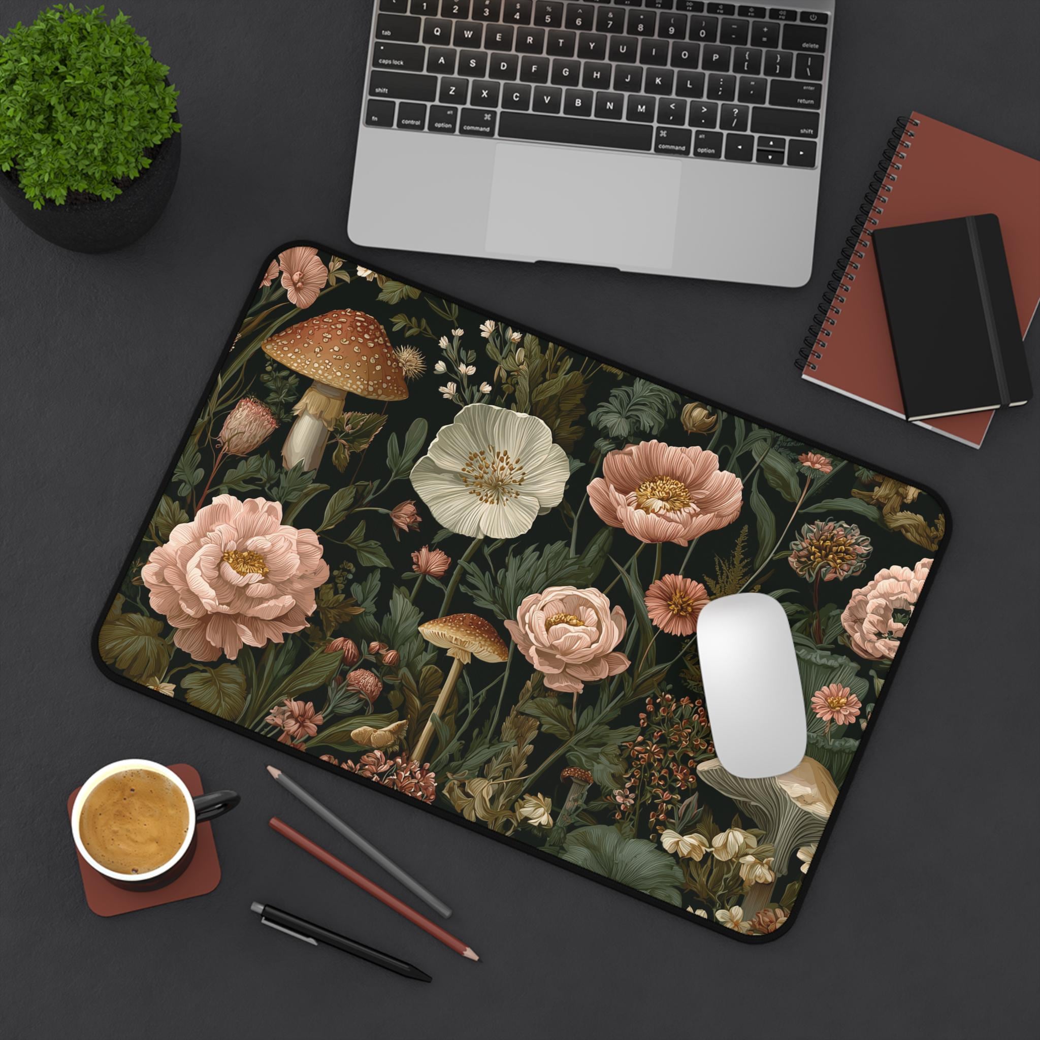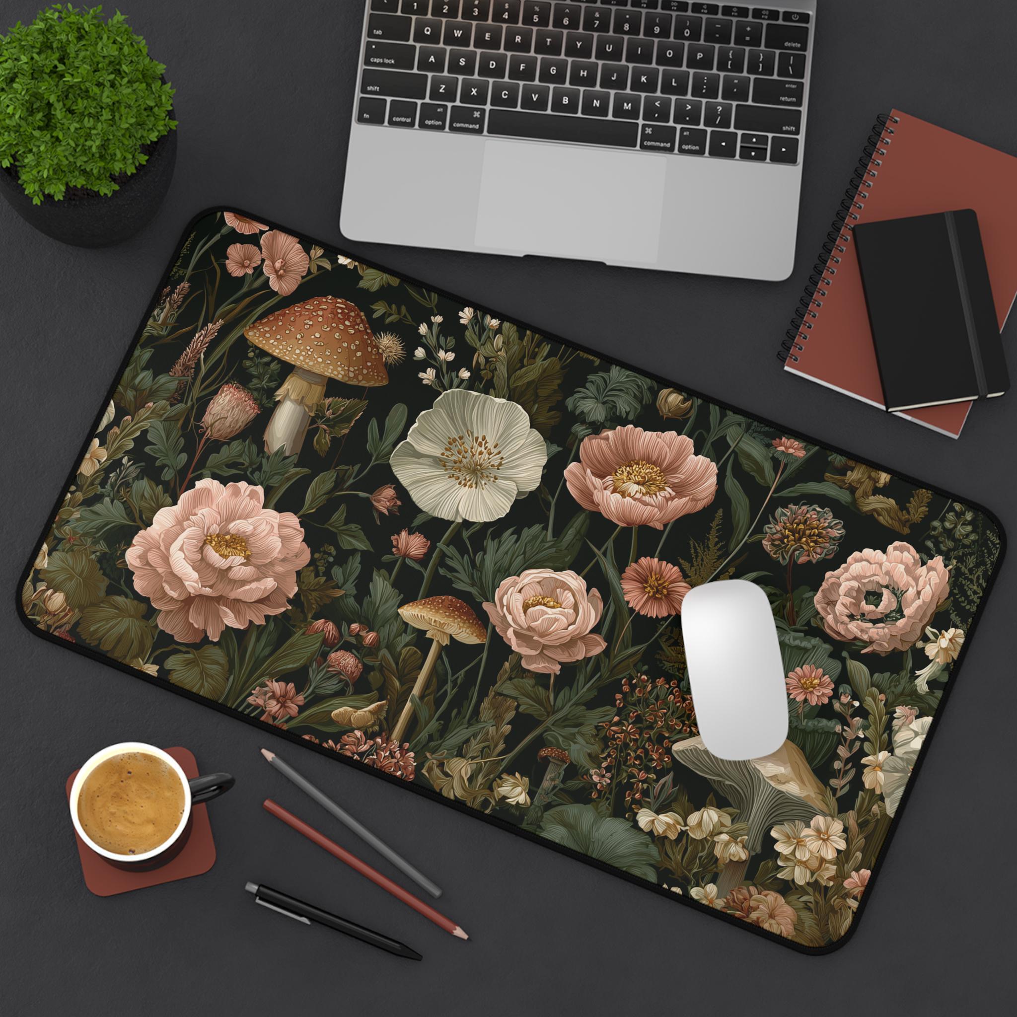 Dark Botanical Desk Mat, Mushroom Floral Mouse Pad, Cottagecore Office Decor, Vintage Aesthetic Desk Pad Gift for Workspace