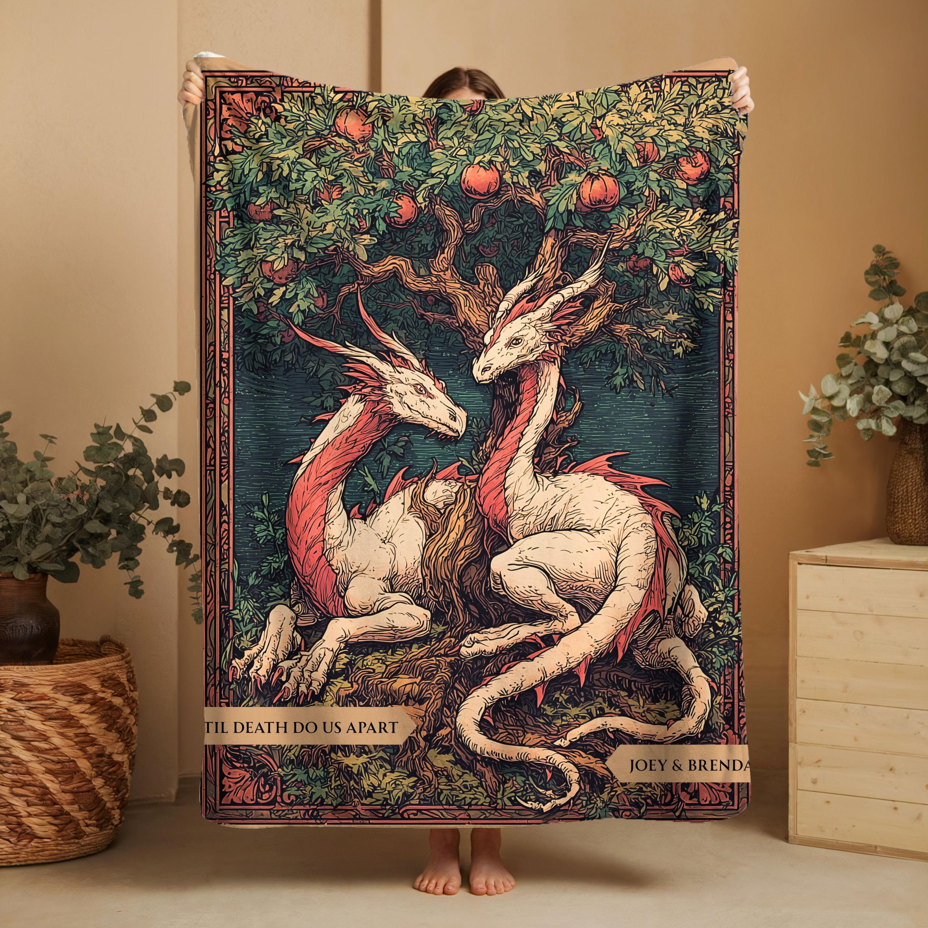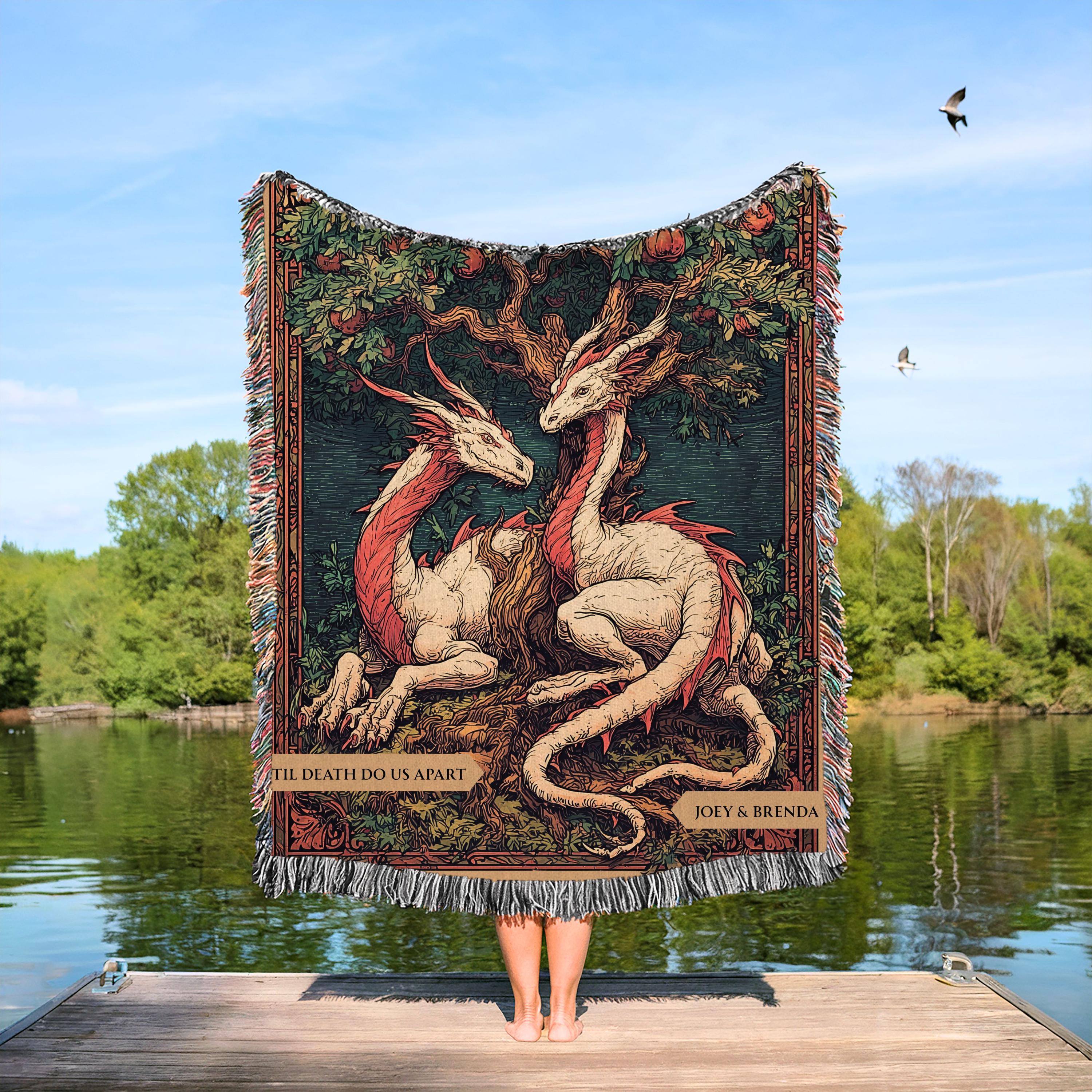 Fantasy Inspired Wedding Couple Blanket, Victorian Gothic Personalized Dragon Lovers Woven Cotton Tapestry Wedding Keepsake Custom Gift
