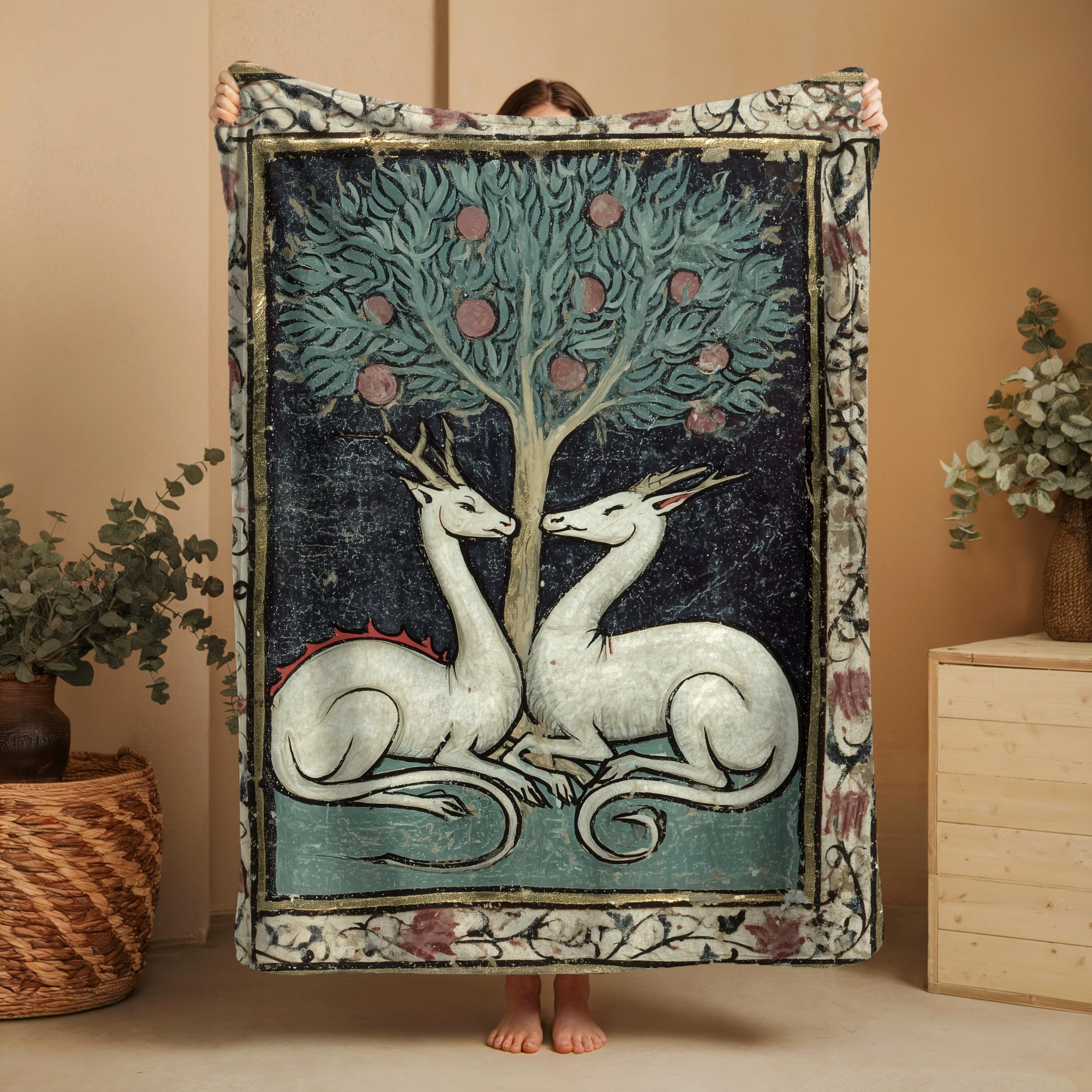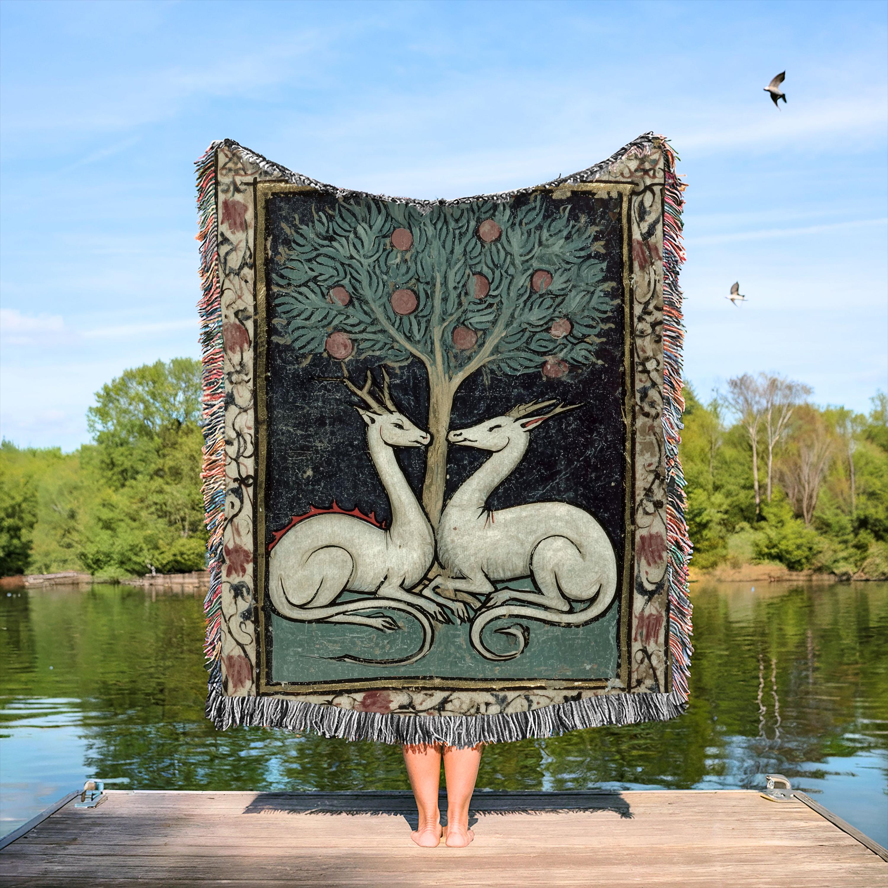 Folklore Dragon Woven Blanket |Old Medieval Aesthetic, Fairytale Inspired Wall Art, Cottagecore Style Fairycore Woven Throw