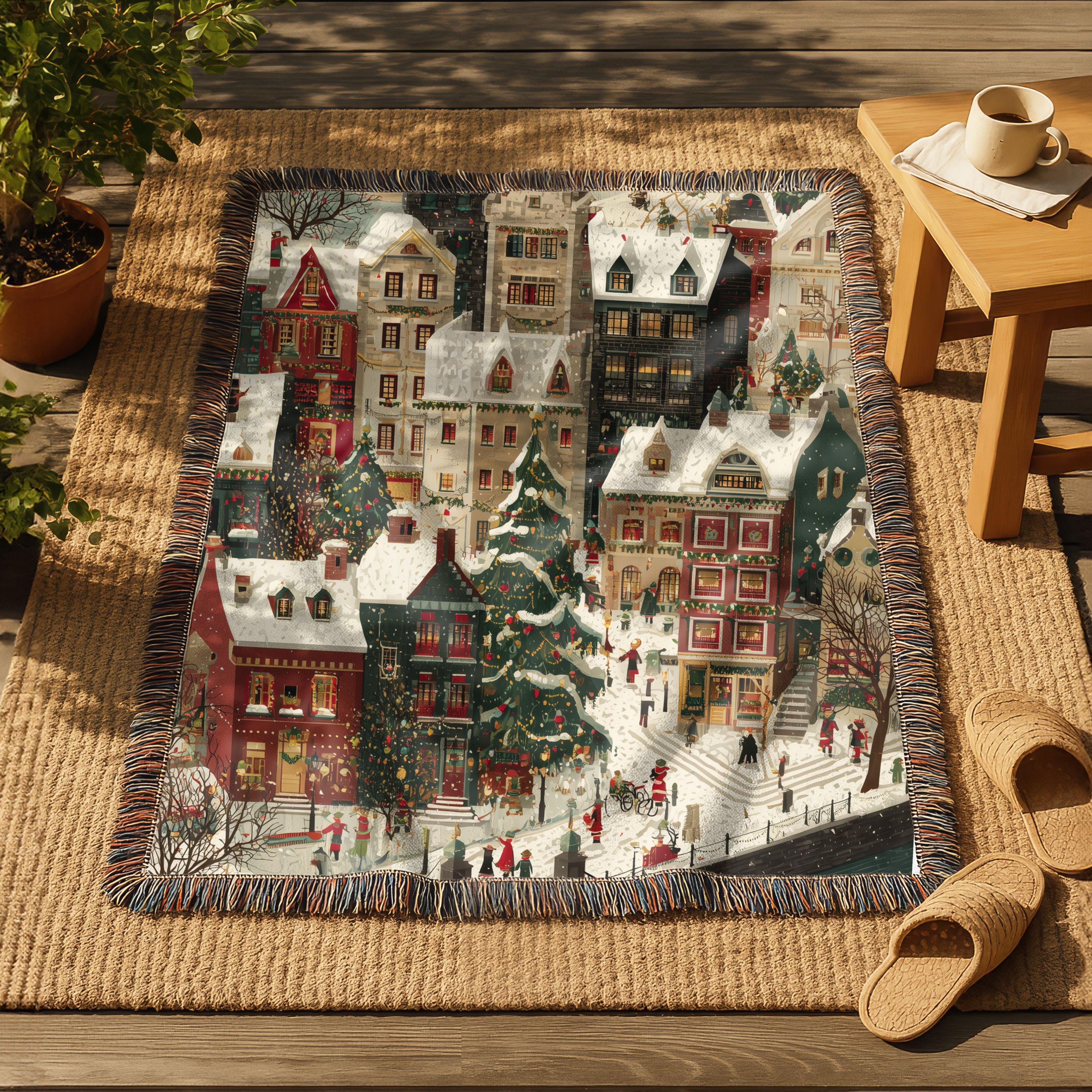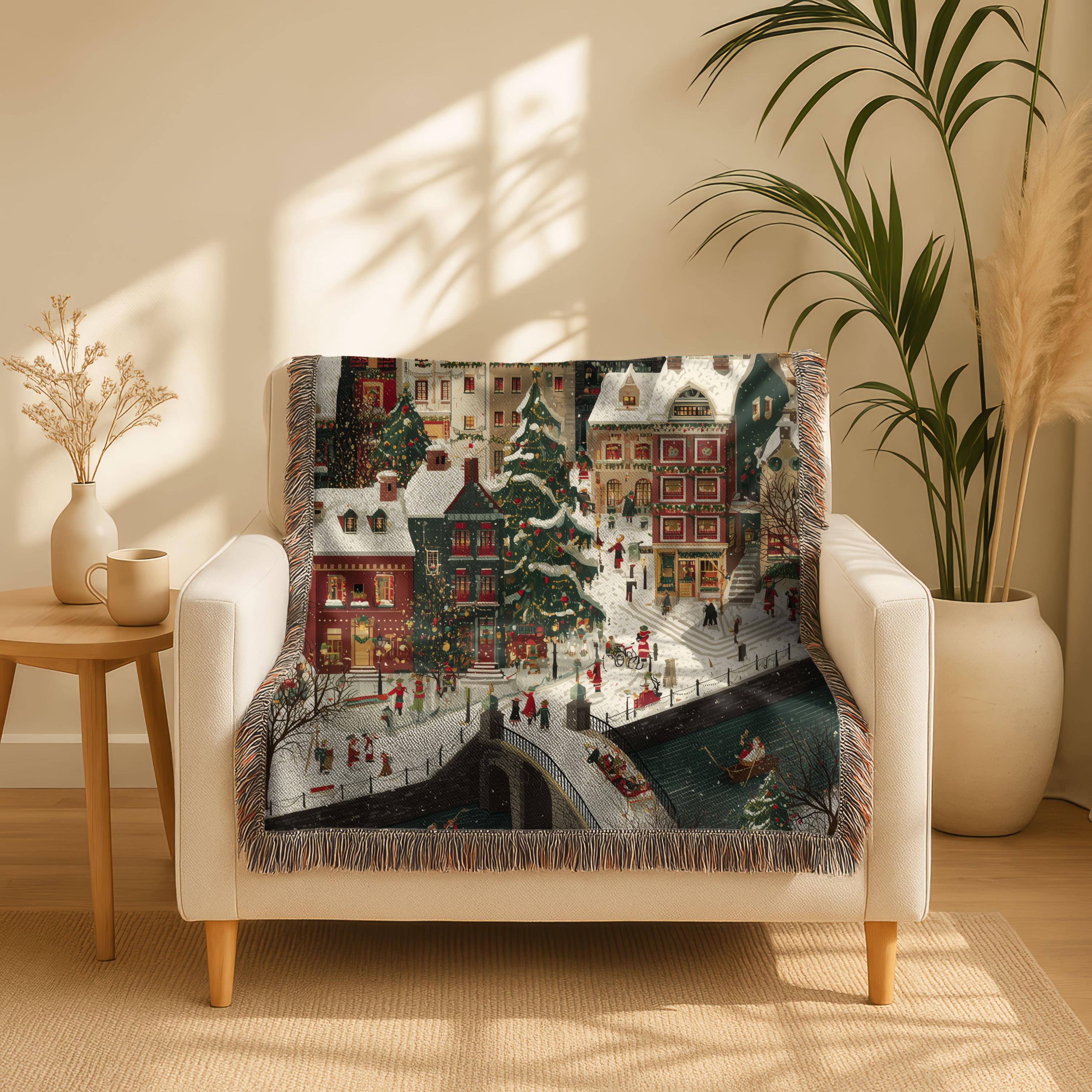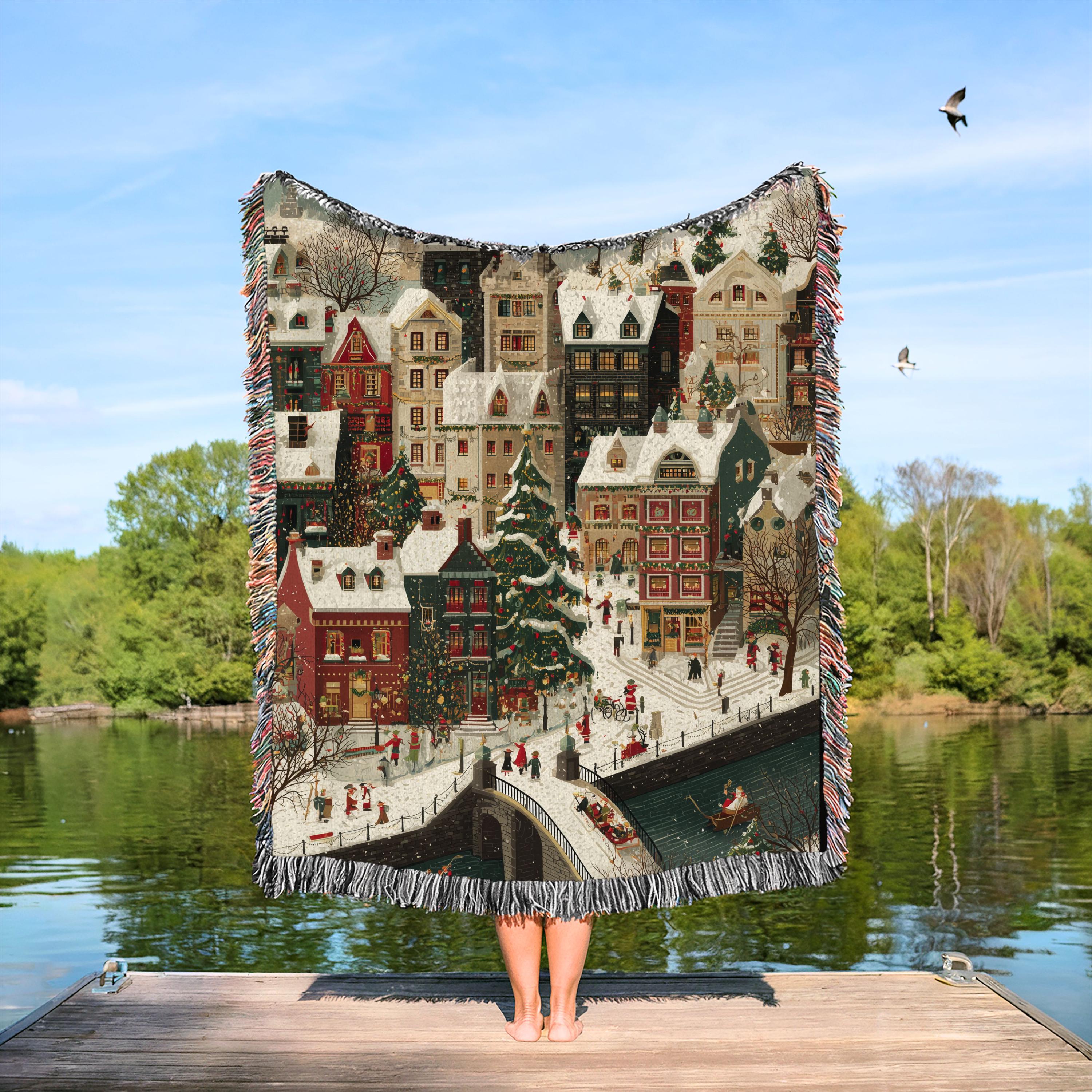 Christmas Village Woven Blanket, Cozy Winter Houses Throw, Nordic Tapestry, Holiday Tapestry Blanket for Xmas Home Decor, Xmas Gift