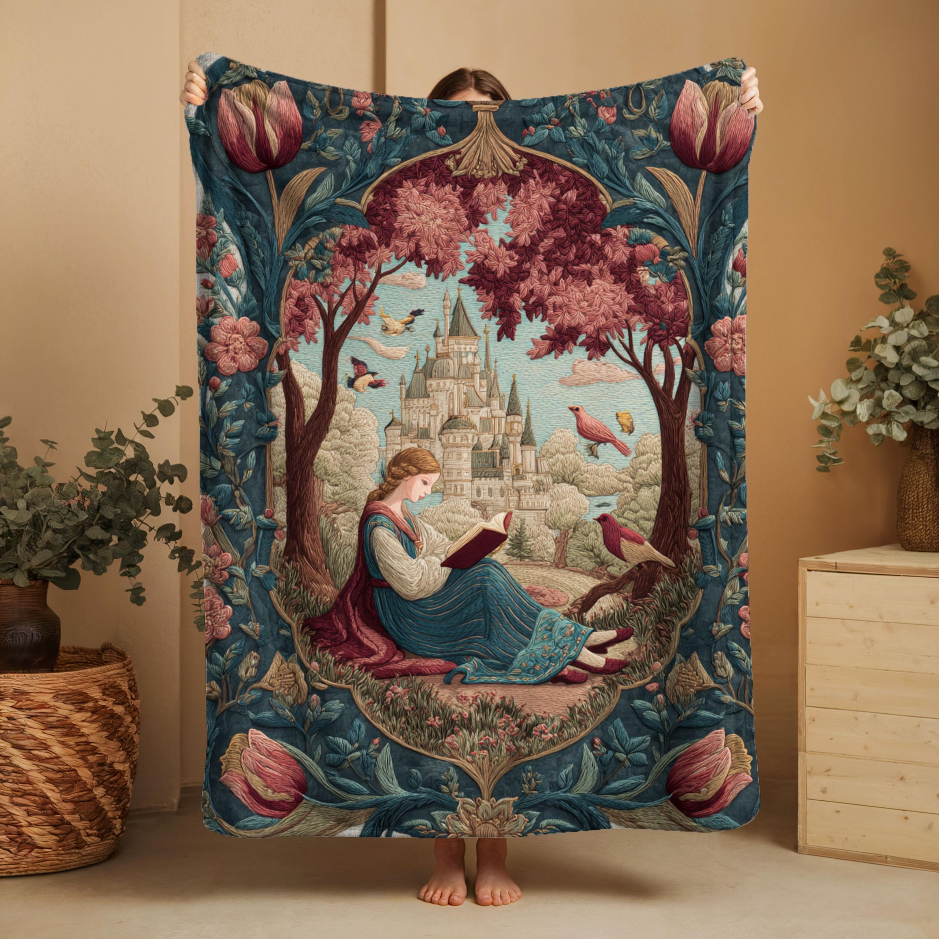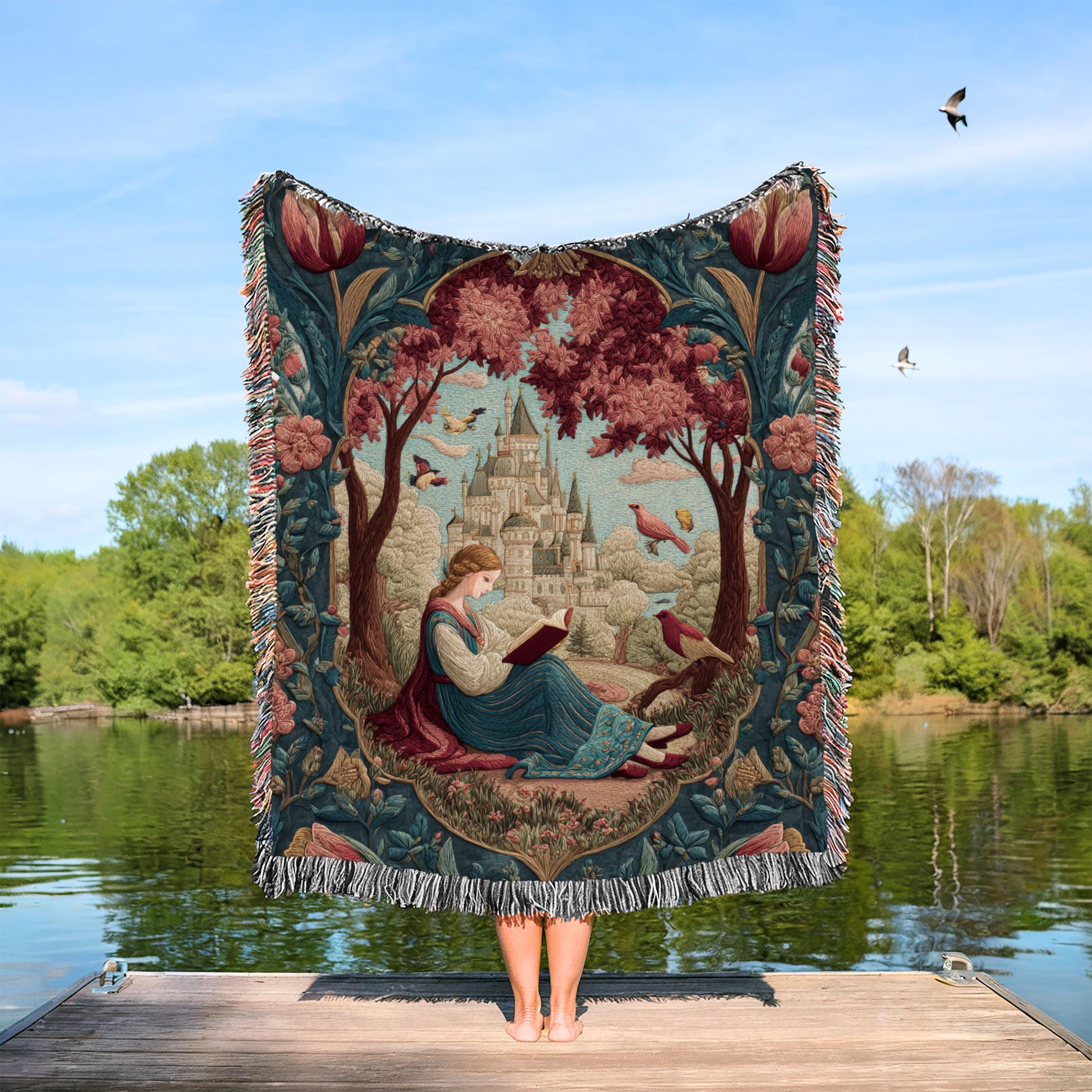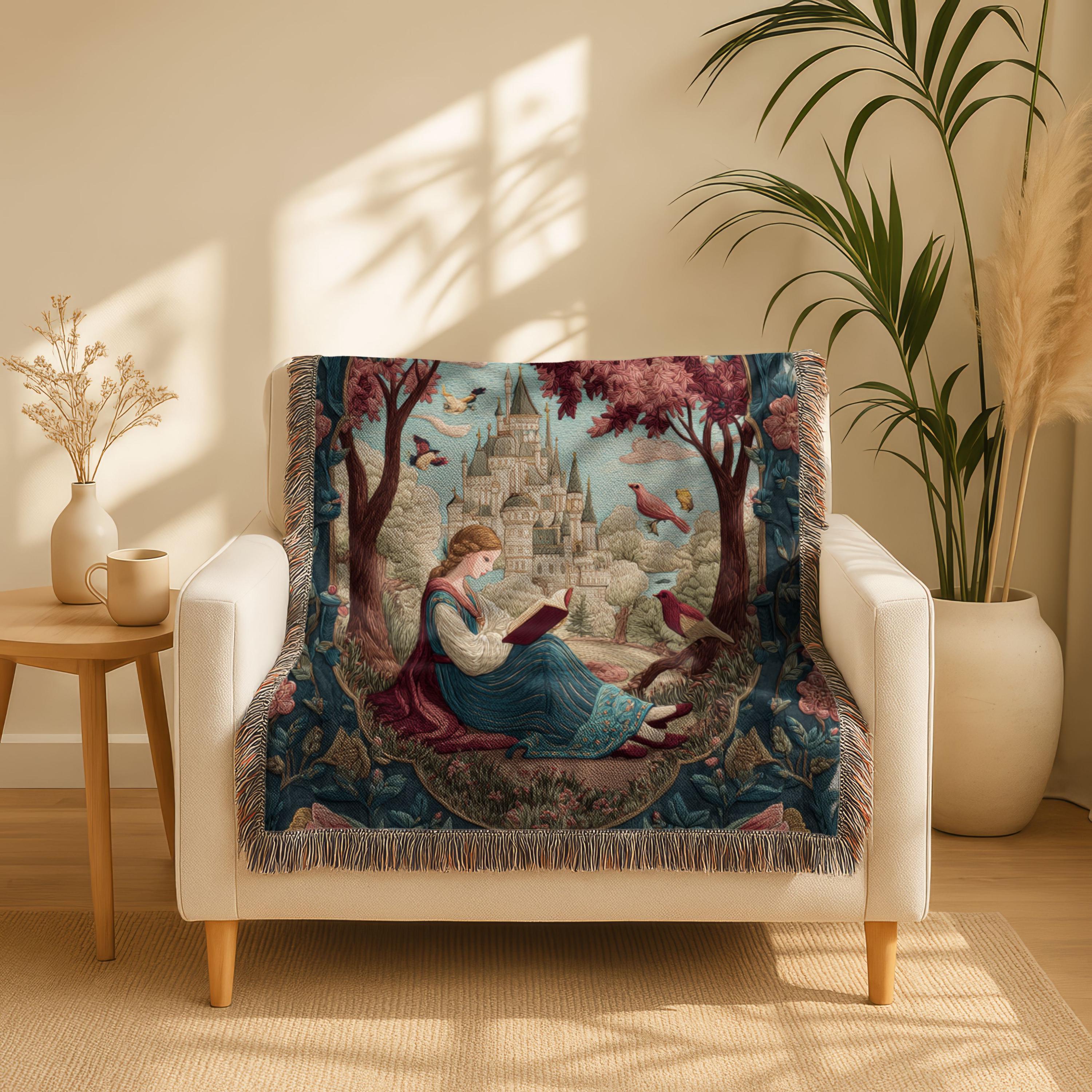 Romantic Folklore reading princess Blanket and woven throw tapestry.