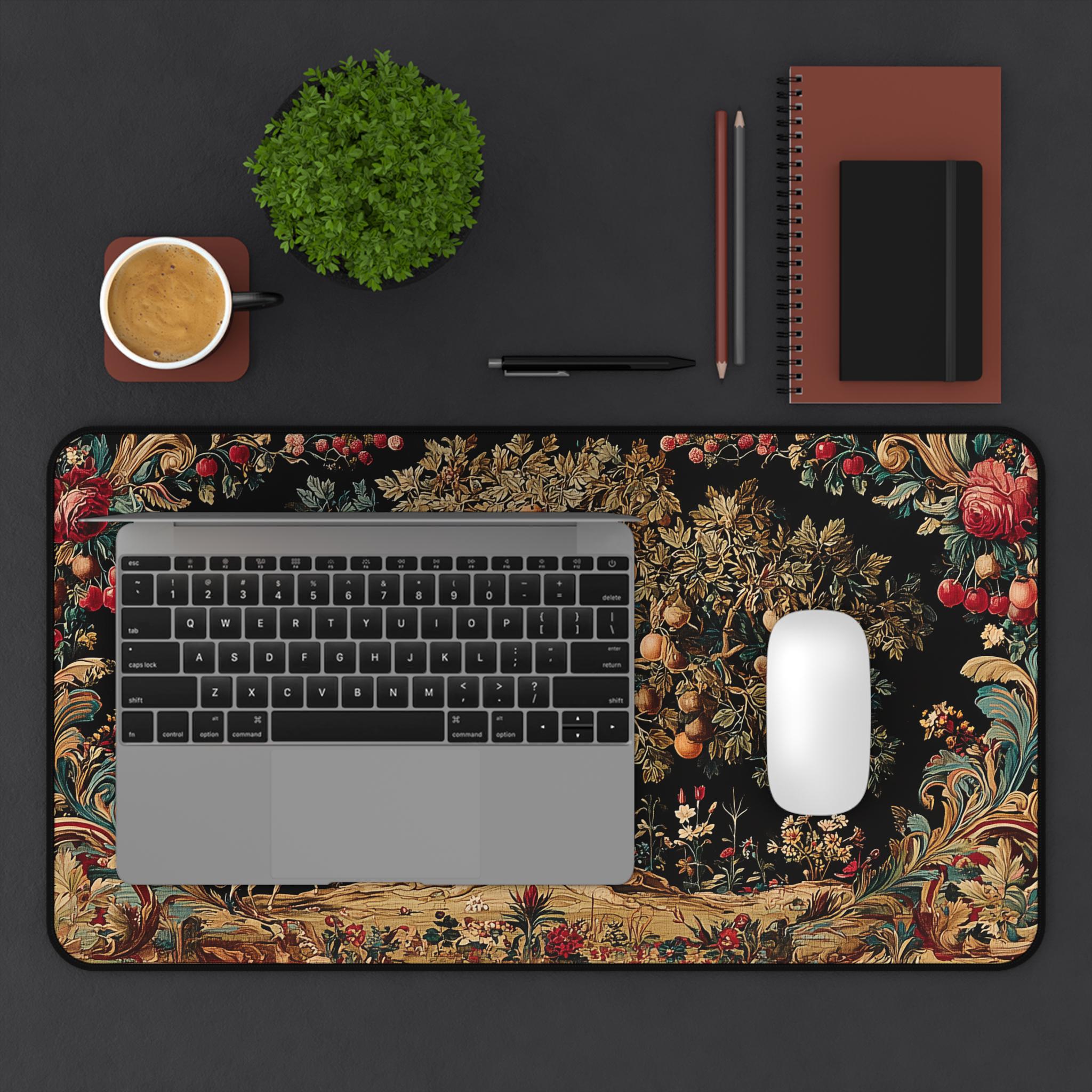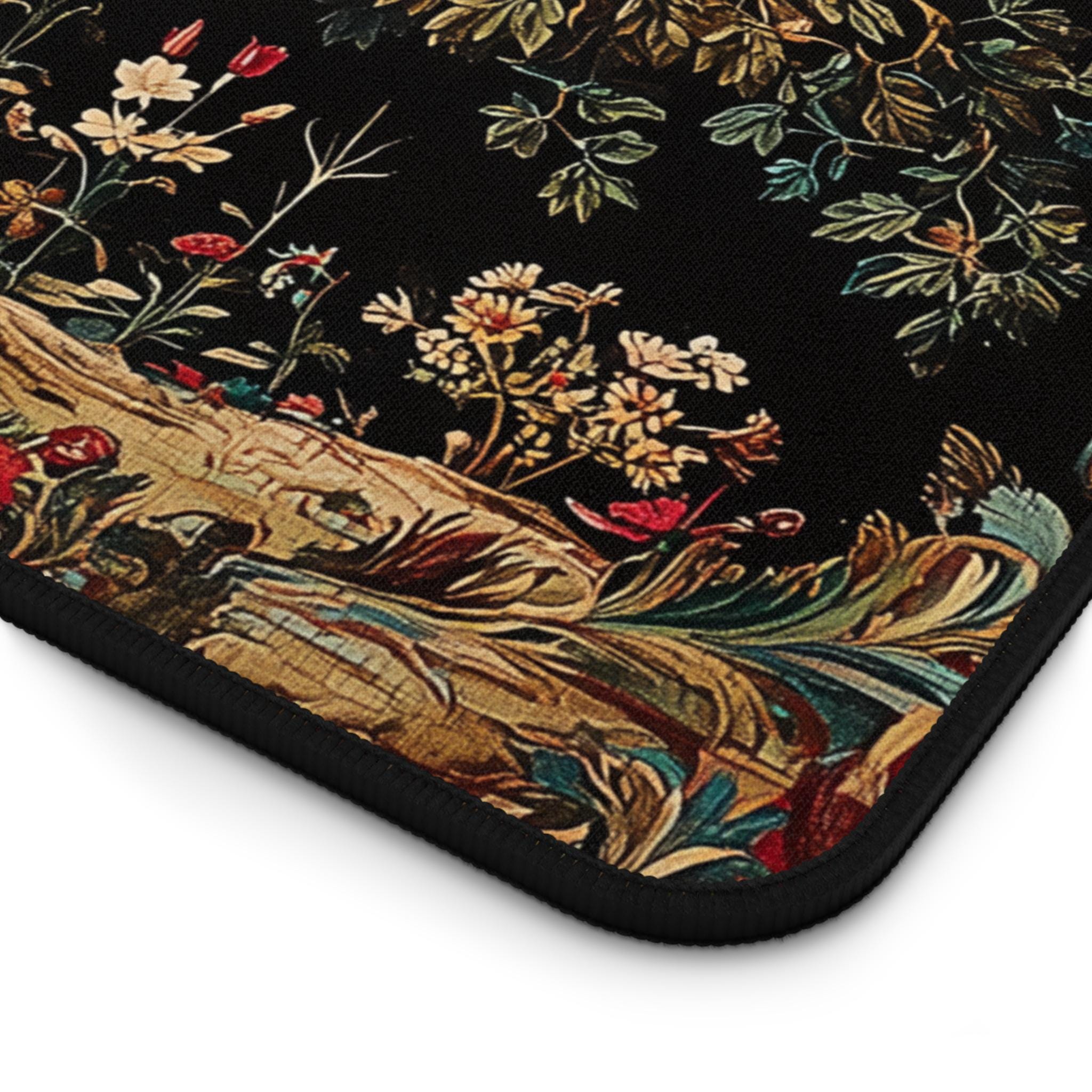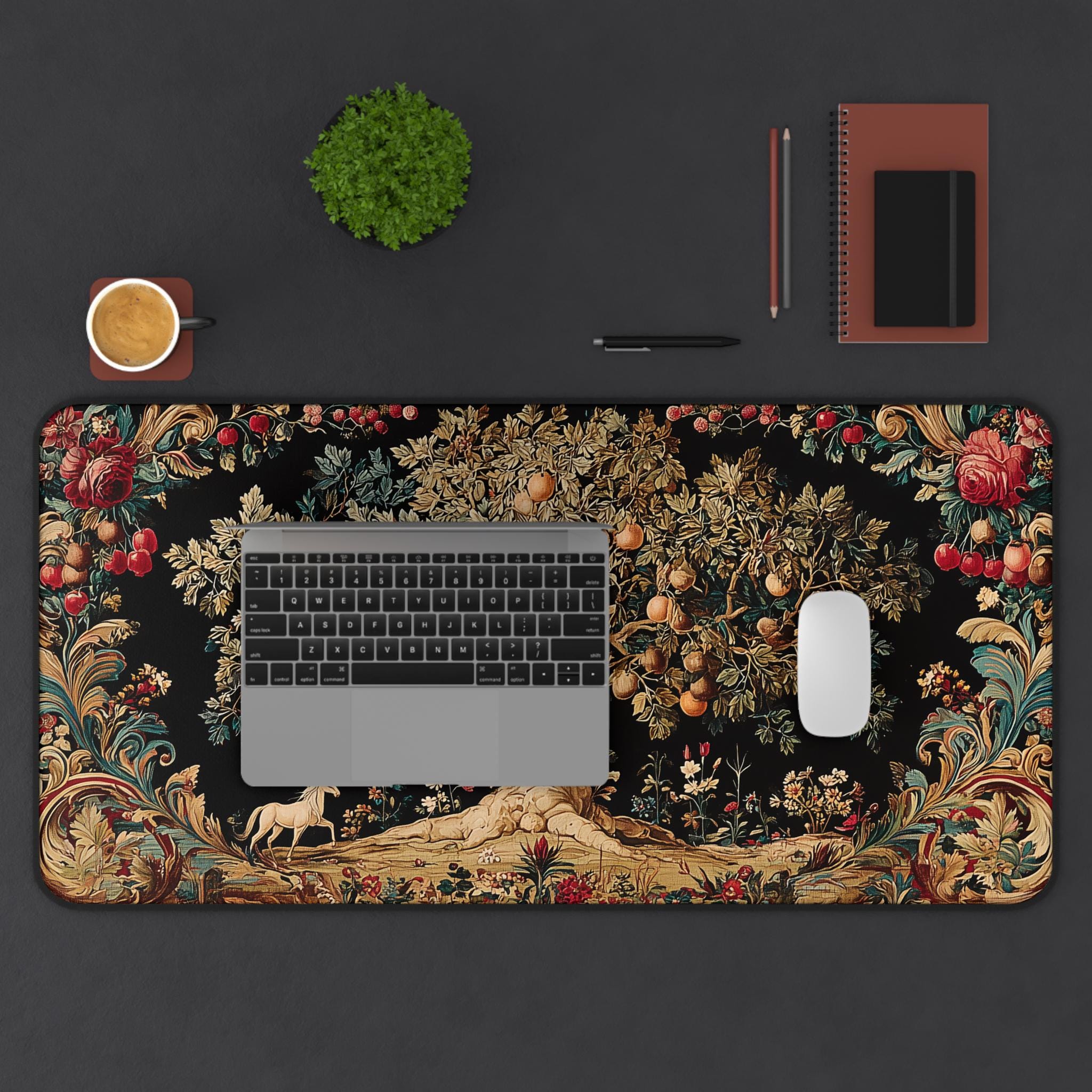 Transform your workspace with this enchanting Medieval Tree of Life Deskmat, featuring a richly detailed illustration of a flourishing ancient tree, mythical unicorn, and vibrant woodland florals. The artwork evokes classic European tapestry style, turning your desk into a place of creativity, magic, and inspiration.