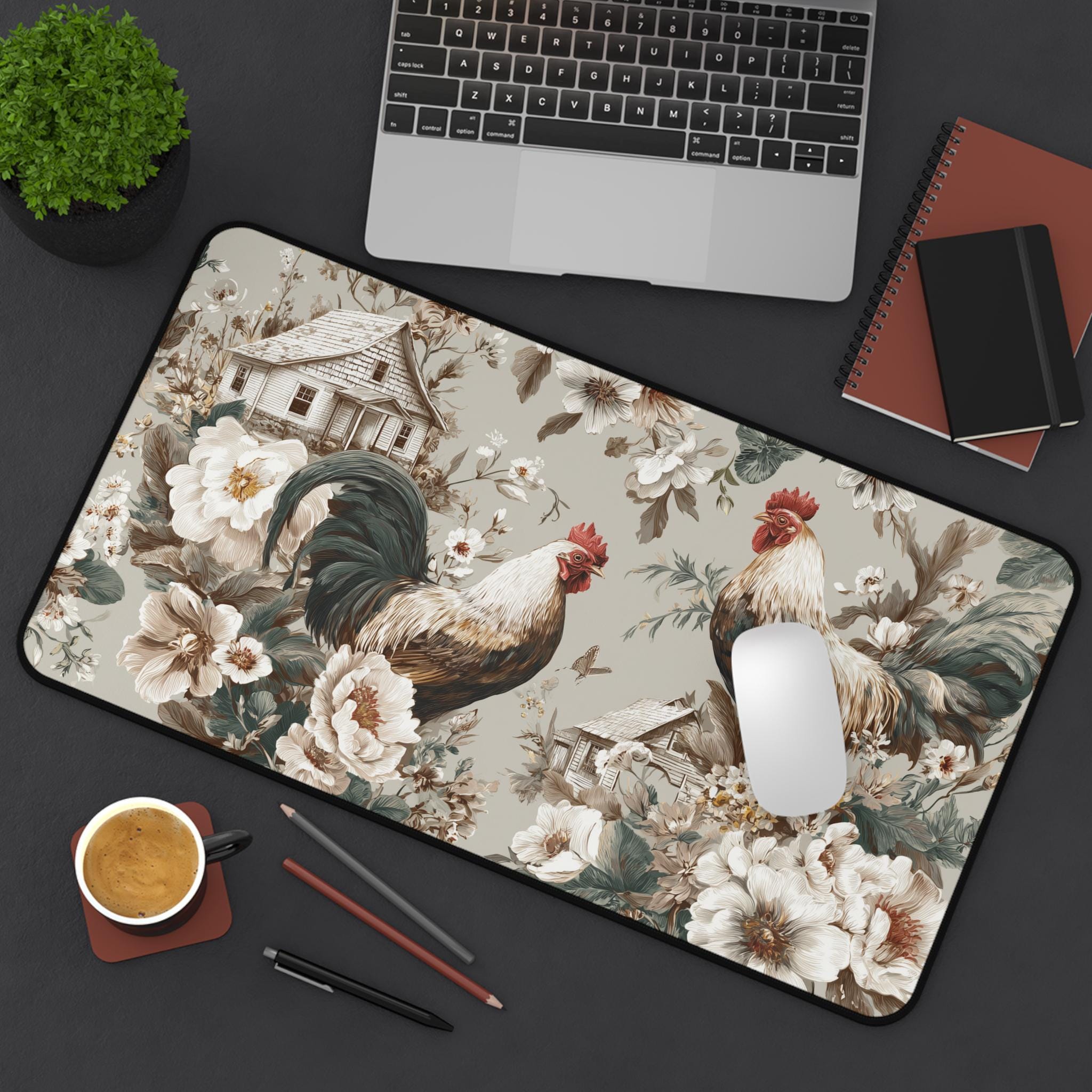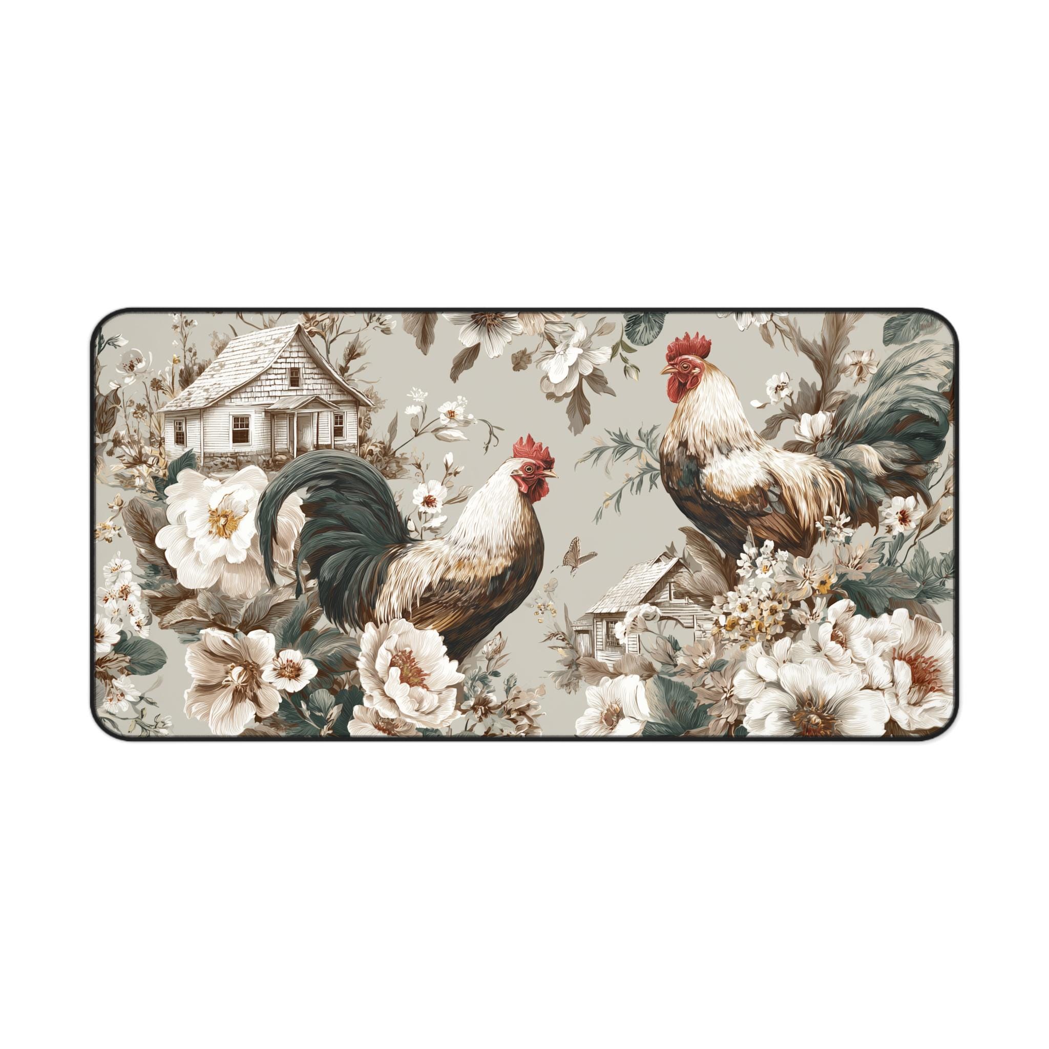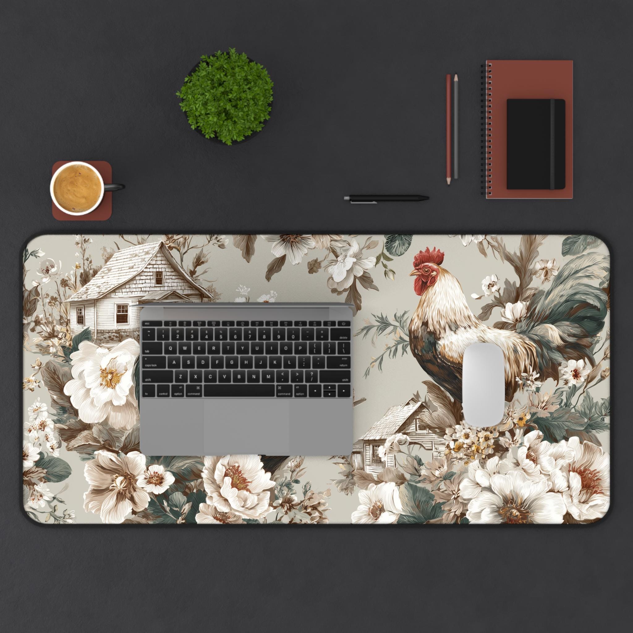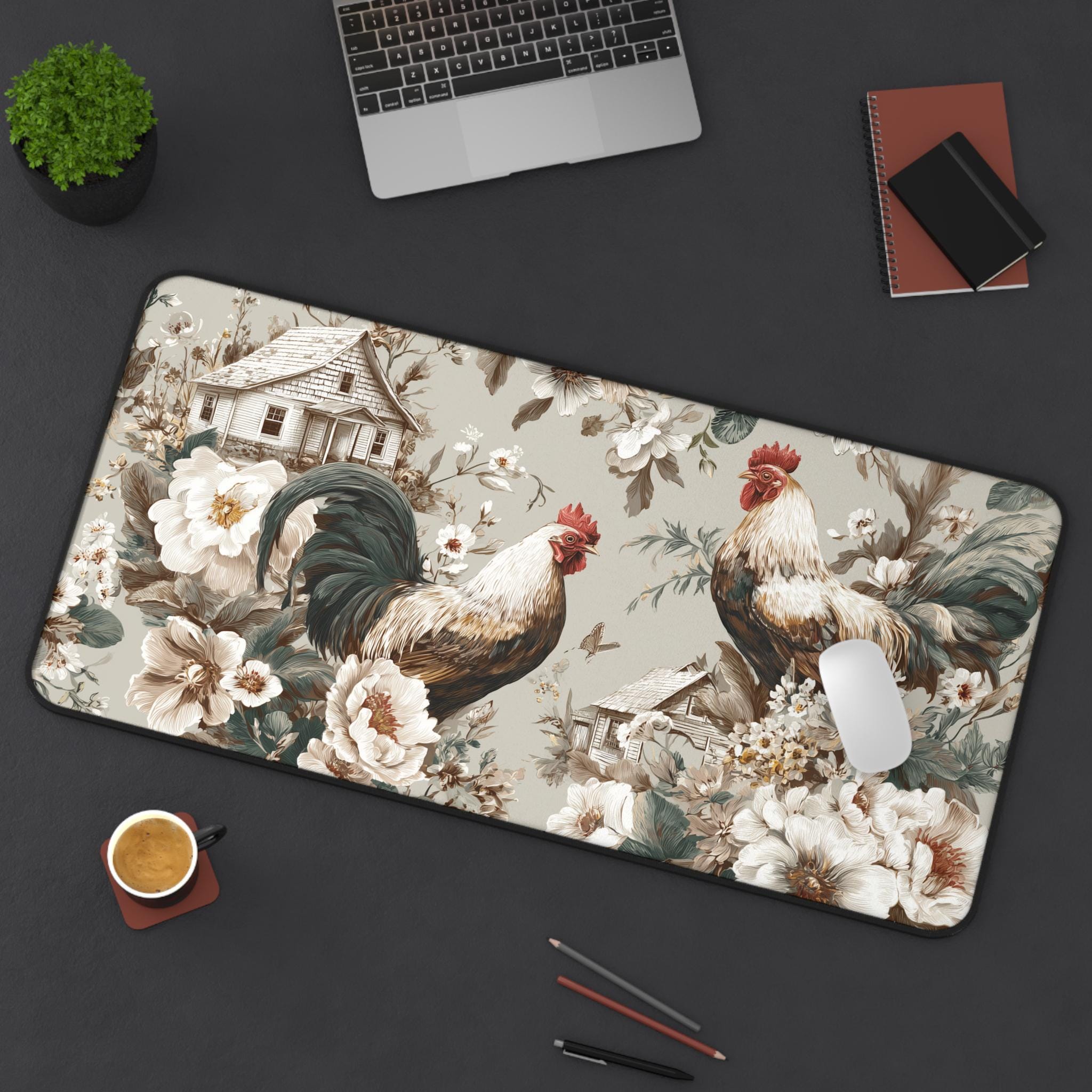 Add rustic farmhouse charm to your workspace with this beautifully illustrated rooster desk mat. Featuring detailed roosters, vintage barns, and soft floral artwork, this oversized mouse pad creates a warm and inviting cottagecore aesthetic. Smooth surface, non-slip rubber backing, and high-quality printing make it perfect for work, gaming, and everyday use.
